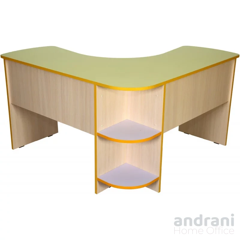 Маса 1300х1300х750 мм + шкаф 400х400х590 мм, меламиново ПДЧ 18/16 мм, ABS кант 1 мм, заоблени ъгли, отворени рафтове. По избор: подвижен шкаф с 3 чекмеджета / 2 отворени рафта / 2 затворени рафта. Цвят: плот жасмин, рамка светъл дъб, фасади лавандула.