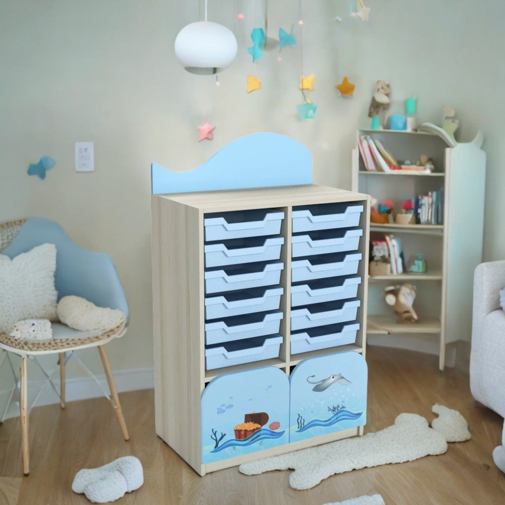 Този шкаф е с размери 702x400x1070 mm и е изработен от 18 mm дебело ламинирано ПДЧ с 3 mm бял меламинов PFL гръб. Фасадата е завършена с 1 mm ABS кант и разполага с профилирани фасади, декорирани с водоустойчив фотопечат на морска тематика. Шкафът съдържа 10 сини пластмасови кутии за съхранение и две плъзгащи се чекмеджета в долната част за ефективна организация. В горната част има декоративен елемент във формата на вълна, изработен от ПДЧ с дебелина 16 мм. Компонентите са сглобени със сигурни елементи, а корпусът е завършен в нюанса на перлен занаятчийски бук.