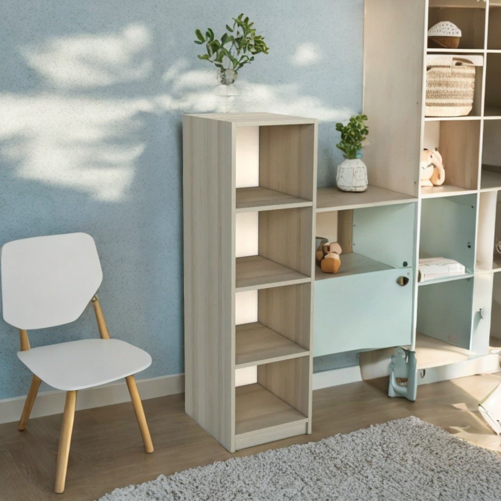 Този шкаф с размери 360x400x1400 мм е изработен от ламинирано ПДЧ с дебелина 18 мм, а гърбът е от бял ламиниран МДФ, предлагащ изчистена и модерна визия. Разполага с четири отворени рафта, идеални за организиране и бърз достъп. Компонентите са сглобени със сигурни елементи, а корпусът на шкафа е завършен в елегантния нюанс на перлен занаятчийски бук.
