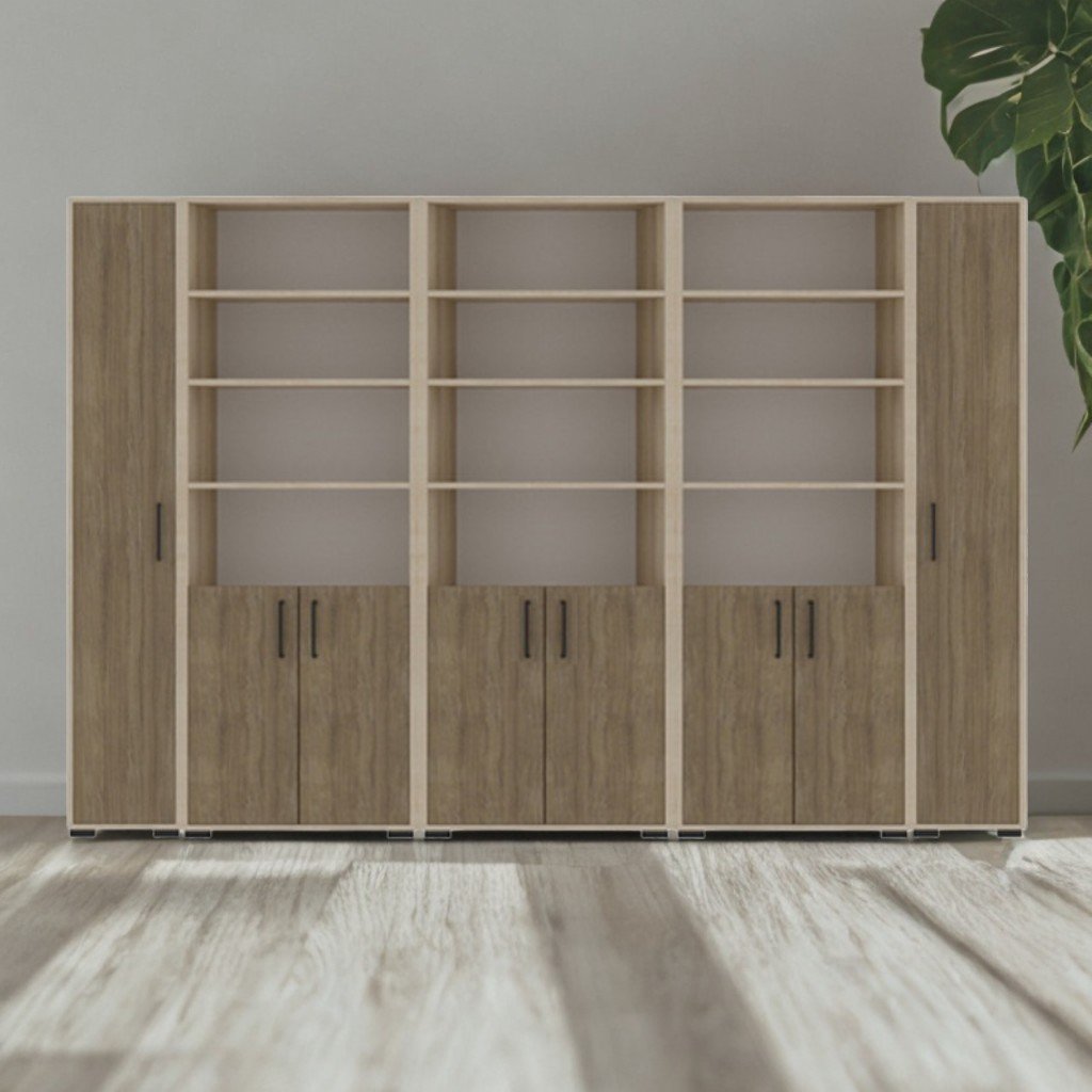 Размери (Д×Ш×В): 2877×405×2025 мм. Мебелен комплект от меламиново ПДЧ 18 мм, с ABS кант: фасади 1 мм, вътрешни 0,5 мм. Гръб в бяло PFL 3 мм. Състои се от 5 елемента: 2 колонни шкафа с 5 рафта (3 с регулируема височина и) и 3 полузатворени шкафа с отворени рафтове отгоре и затворени рафтове отдолу. Сигурен монтаж, пластмасови крачета. Цвят: занаятчийска перла, кафяв градски дъб.