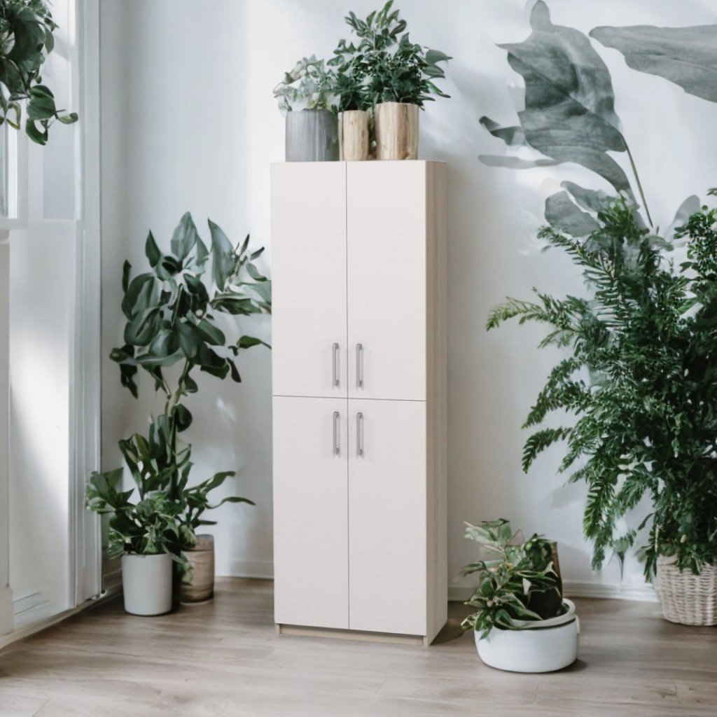 Затворен шкаф - размери: 702×405×2115 мм. Изработен от 18 мм меламиново ПДЧ, 2,5 мм HDF гръб. Съдържа 6 затворени рафта, с възможност за регулиране на височината на някои рафтове. Корпус: Artisan Pearl (ABS 0,5 mm), Фасади: светло сиво (ABS 1 mm). с регулируема височина и метални крачета (0–30 mm) за неравни подове. Сглобен със сигурни крепежни елементи, предназначен за стенен монтаж.