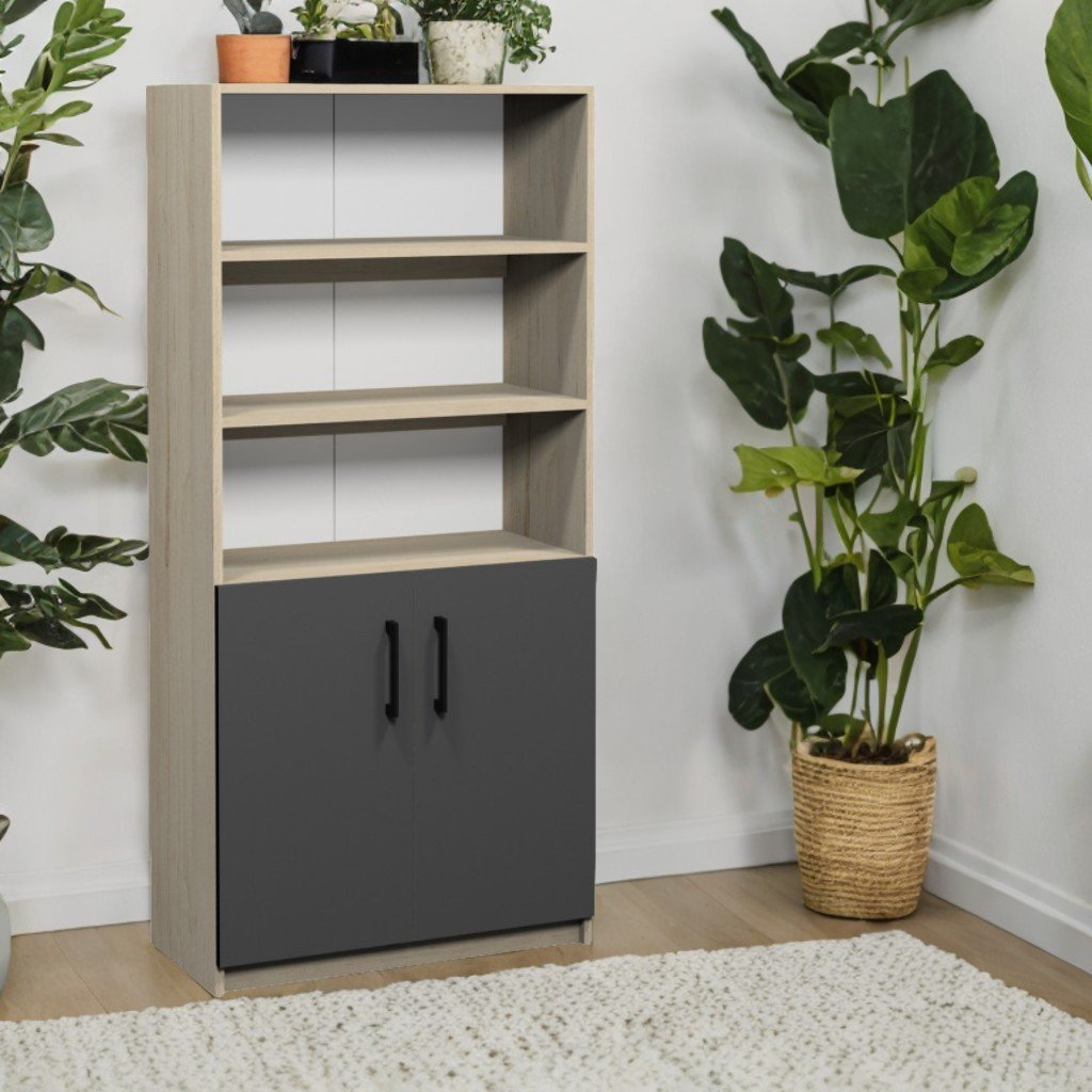 Шкаф - размери: 800×370×1710 мм. Меламиново ПДЧ 18 мм, гръб бял PFL 2,5 мм. Корпус Pearl Beech Artisan, фронтове Graphite Grey. 2 с регулируема височина и затворени рафта, 3 отворени рафта (1 подвижен). Сигурно прилягане, с регулируема височина и метални крачета (0–30 mm).