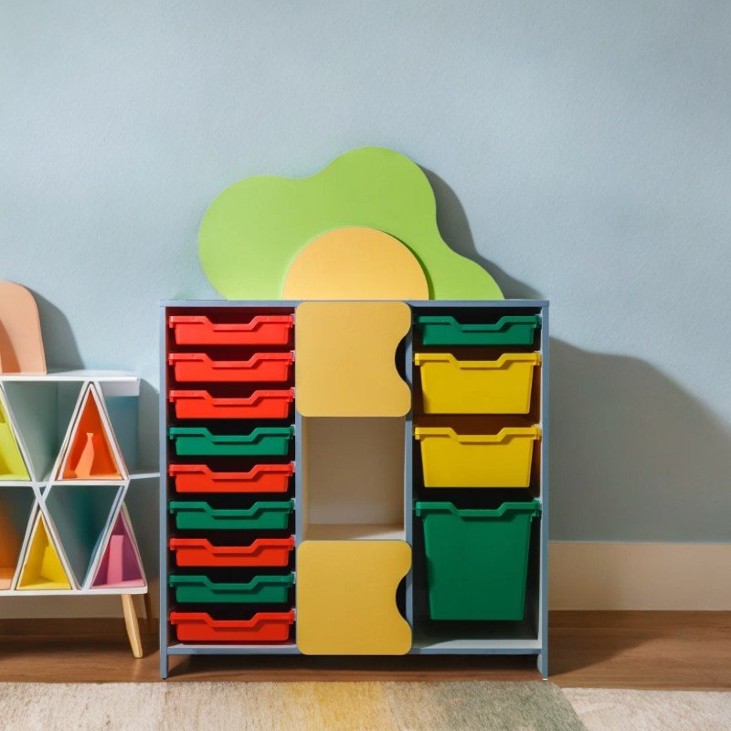 С размери 973x400x1365 mm и тегло 32,44 kg, този шкаф е изработен от 16 mm меламиново ПДЧ с 3 mm бял меламинов PFL гръб. Покритията са направени със сребрист ABS кант: 1 мм отвън и 0,5 мм отвътре. Включва 13 пластмасови кутии за съхранение в жълто, червено и зелено в различни размери, заедно с 3 отворени и затворени рафта със специални ръбове за лесен достъп. Декоративният елемент във формата на цвете придава допълнителен чар. Всички компоненти са сглобени със системи за безопасност и шкафът е фиксиран към стената за защита на децата. Издръжливите пластмасови уплътнения увеличават издръжливостта. Цветове: жълто, лайм зелено, червено, бежово. Гаранция: 24 месеца.