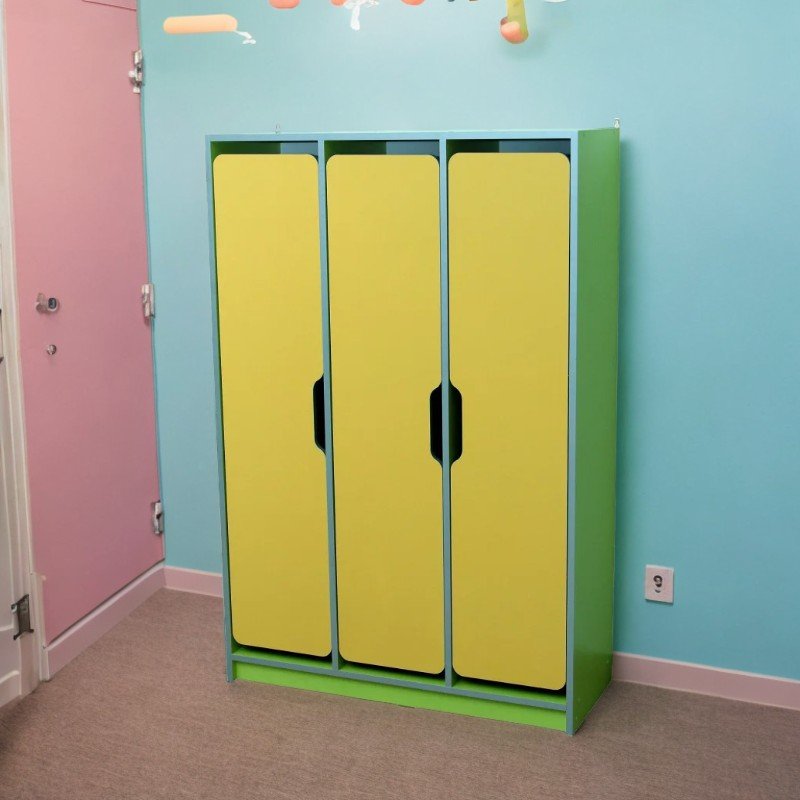 Моделът разполага с 3 декоративни вратички със заоблени ъгли и ергономична система за отваряне. Всяко отделение включва два рафта (горен и долен) и две хромирани закачалки.