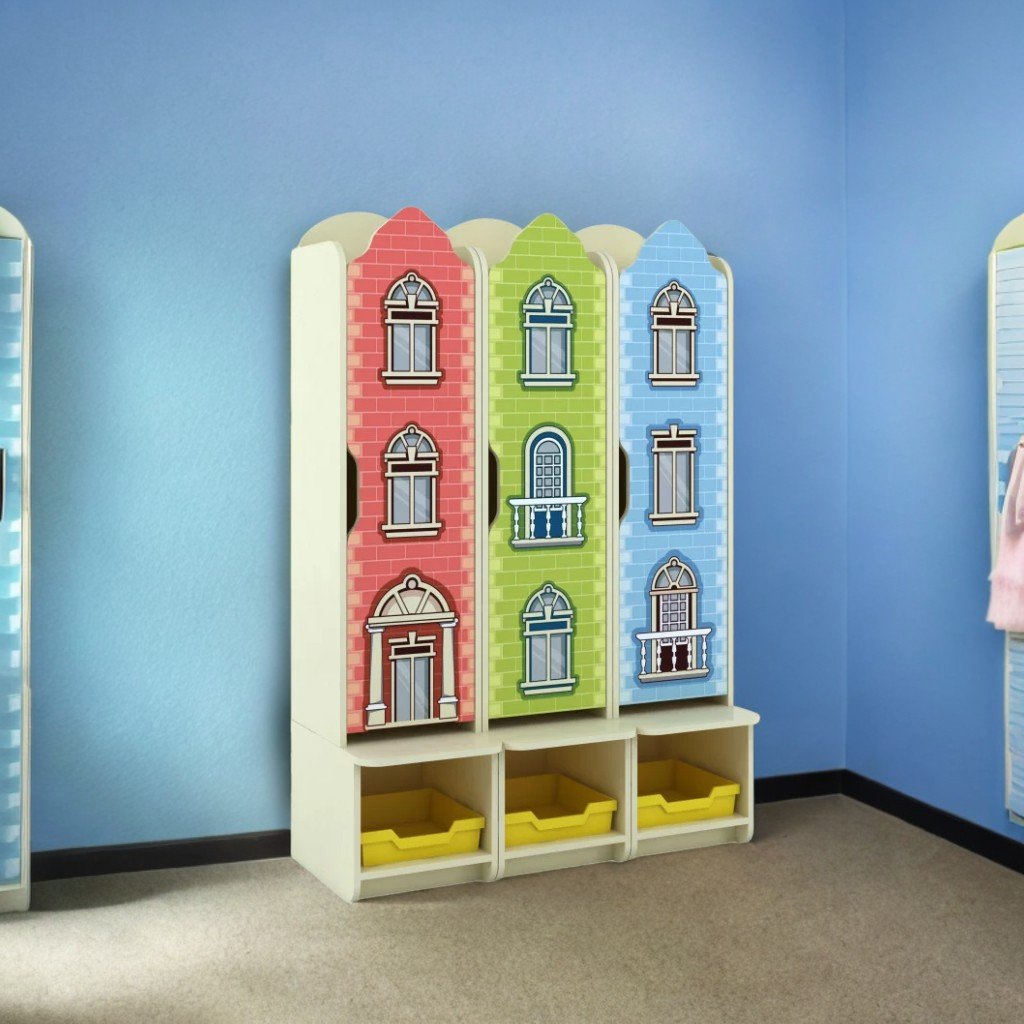 Съблекалня с 3 отделения, идеална за детски градини и учебни помещения. Изработен от 16 мм меламиново ПДЧ, с 3 мм меламинов PFL гръб. Фасадата е завършена с 1 мм бежов ABS кант, а вътрешните елементи с 0,5 мм кант. Вратите със заоблени ъгли са със специален изрез за отваряне и са декорирани със фотопечат, представяща фасада на сграда с прозорци и врати, защитени с нетоксичен акрилен лак на водна основа.