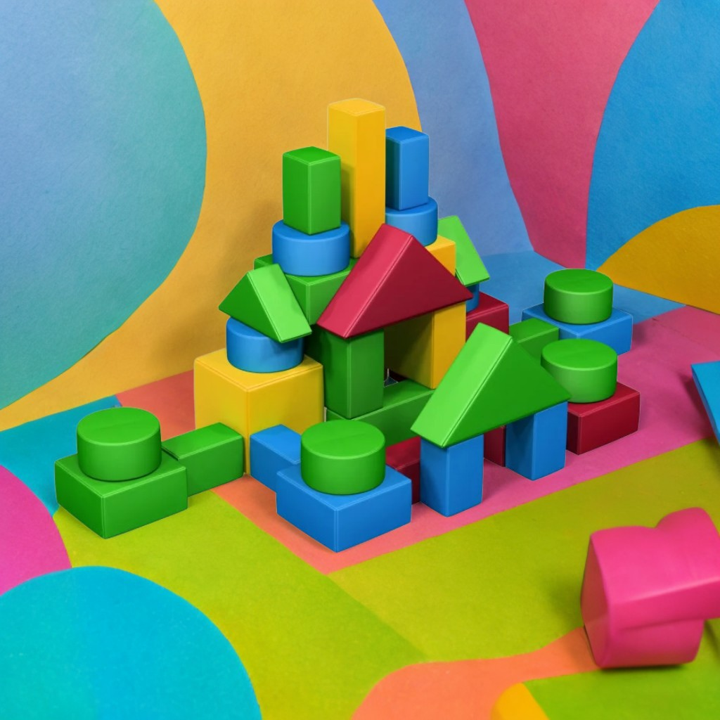 Комплект пух "Soft Constructor" включва 37 меки геометрични модула в 8 различни форми, изработени от полиуретанова пяна с плътност 22 kg/m³ и покрити с PVC материал (620-630 g/m²) в червен, жълт, светло зелен и син цвят. Шевовете са подсилени с издръжливи конци, а модулите са с цип за комфорт.