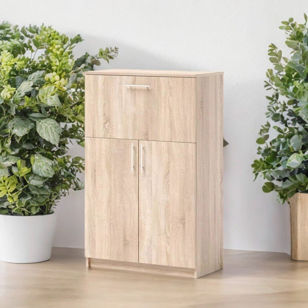 Шкаф 800х400х1260 мм. Меламиново ПДЧ 18 мм, ABS кант (преден 1 мм, вътрешен 0,5 мм), бял PFL гръб 3 мм. Оборудван с 4 рафта за практично съхранение, хромирани дръжки, сглобени със сигурен хардуер. Цвят: дъб сонома.