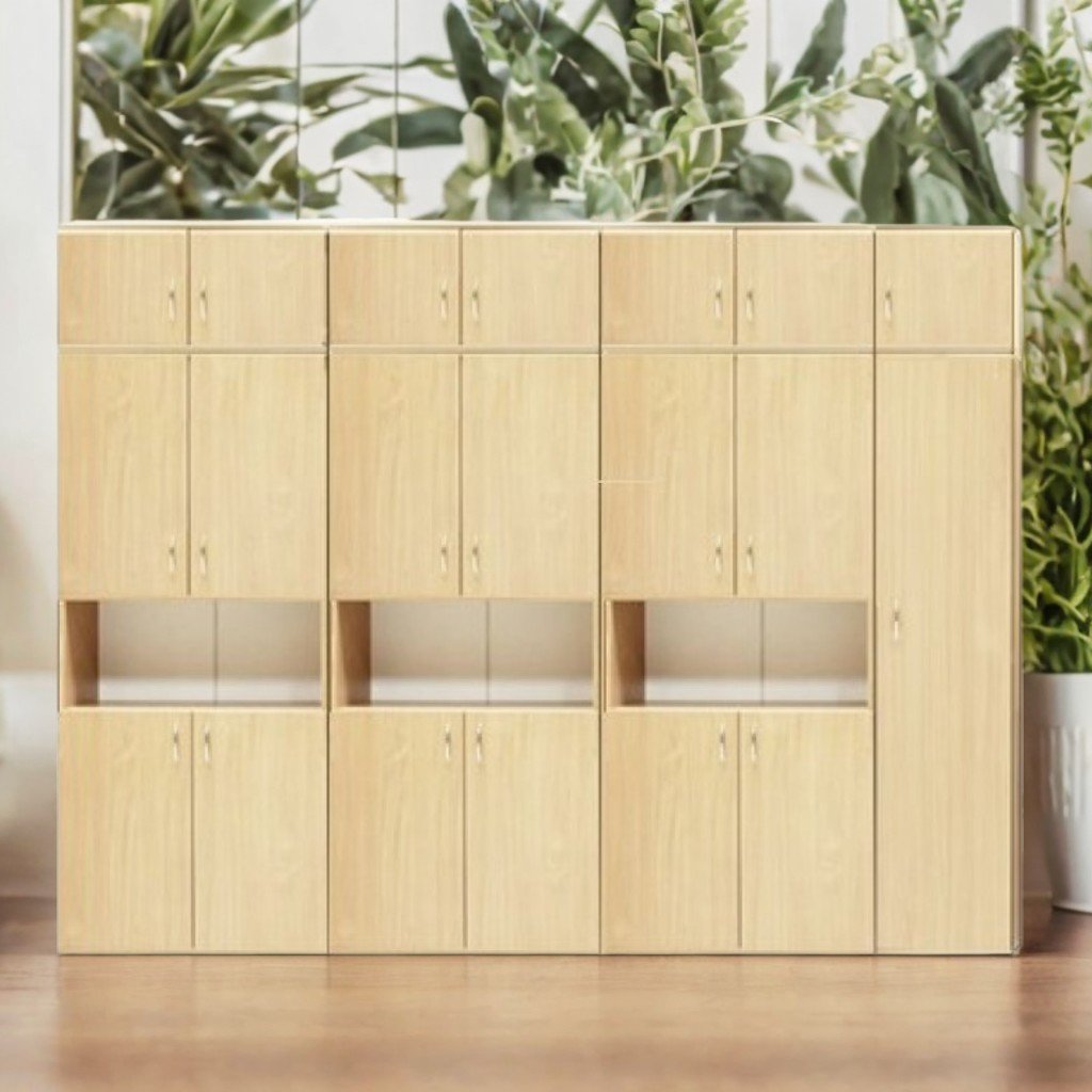 Размери (Д×Ш×В): 2808×403×2186 мм. Комплект мебели от меламиново ПДЧ с дебелина 18 мм. Фасадата е завършена с ABS кант 1 мм, а вътрешните части с ABS кант 0,5 мм. Гърбът е изработен от бял меламин PFL с дебелина 3 мм. Комплектът се състои от 4 отделения: първите три включват ниша, 4 затворени рафта и стенен шкаф; четвъртото отделение съдържа рафт, овална хромирана закачалка и стенен шкаф. Шкафовете са снабдени с хромирани дръжки и закрепени с дървени дюбели. Монтажът се извършва със специални и безопасни крепежни елементи. Комплектът е снабден с с регулируема височина и пластмасови крачета. Цветове: бук, светъл дъб.