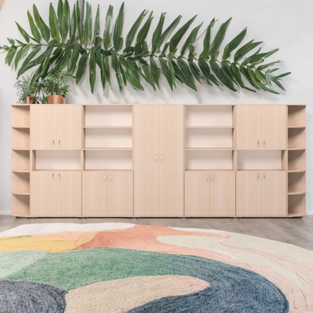 Размери (Д×Ш×В): 4870×430×1816 мм. Комплект мебели от меламиново ПДЧ 18 мм. Фасадата е завършена с ABS кант 1 мм, а вътрешните части с ABS кант 0,5 мм. Задната стена е от бял меламин PFL с дебелина 3 мм. Комплектът се състои от 7 отделения: (1) Ъглов шкаф с 5 заоблени рафта; (2) Етажерка с 4 врати – включва 4 затворени рафта и централна отворена ниша; (3) Библиотечен шкаф с 3 отворени ниши и 2 затворени рафта; (4) Гардероб - оборудван с рафт и прибираща се овална метална закачалка (дължина 350 мм); (5) Библиотечен шкаф, идентичен на отделение 3; (6) Етажерка с 4 врати – 4 затворени рафта и отворена ниша; (7) Ъглов шкаф, идентичен на отделение 1. Частите са сглобени със сигурни крепежни елементи и са предназначени за стенен монтаж. Шкафовете са оборудвани с пластмасови крака. Налични цветове: занаятчийска перла, светъл дъб.