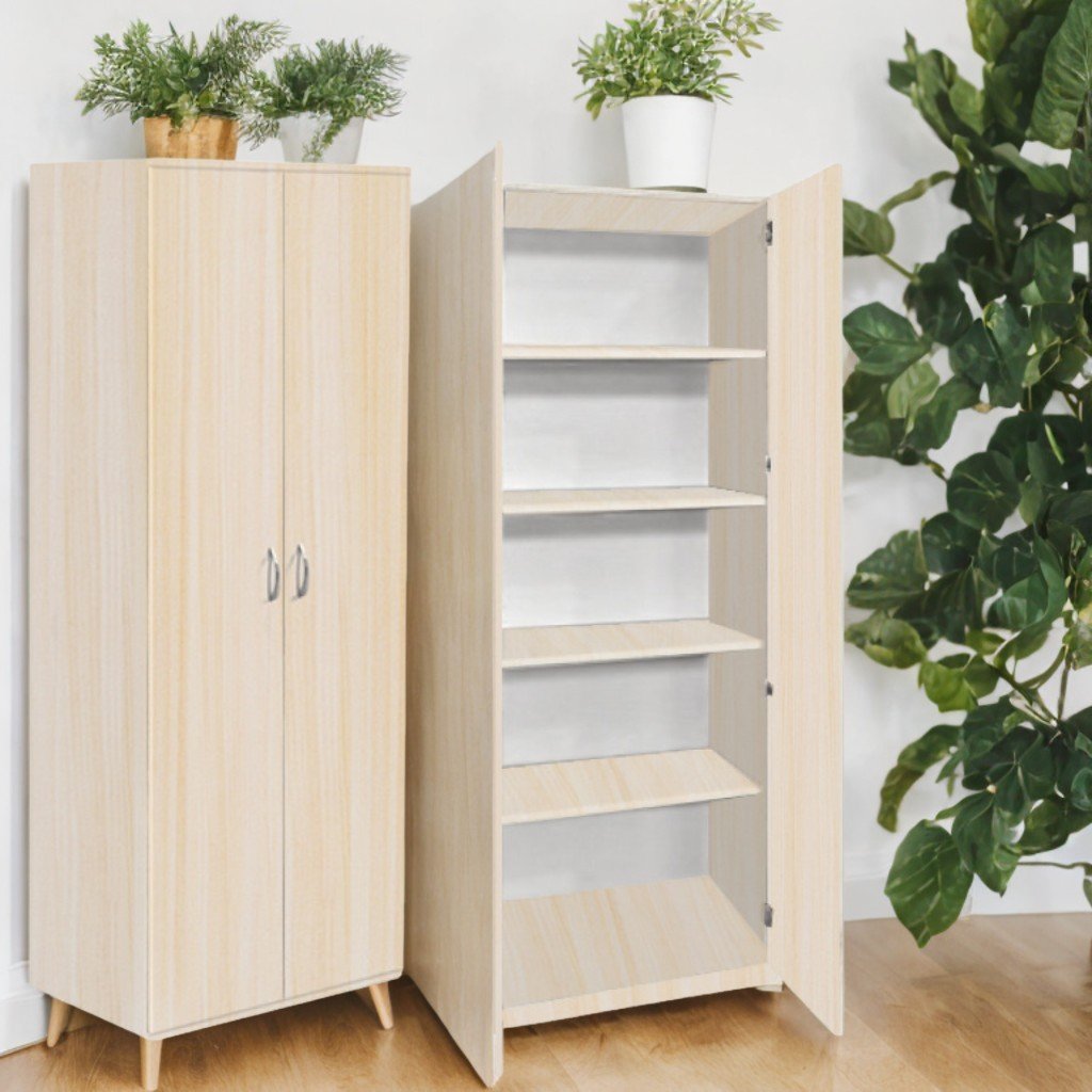 Размери (Д×Ш×В): 802×403×1816 мм. Тегло: 57,28 кг. Шкафът е изработен от меламиново ПДЧ с дебелина 18 мм. Фасадата е завършена с ABS кант 1 мм, а вътрешните части са с ABS кант 0,5 мм. Задната стена е от бял меламин PFL с дебелина 3 мм. Конфигурацията включва 5 затворени рафта, с възможност за регулиране на разстоянието между тях. Шкафът е оборудван с хромирани дръжки и с регулируема височина и пластмасови крачета. Частите се сглобяват със специални и сигурни крепежни елементи. Налични цветове: бук, светъл дъб.