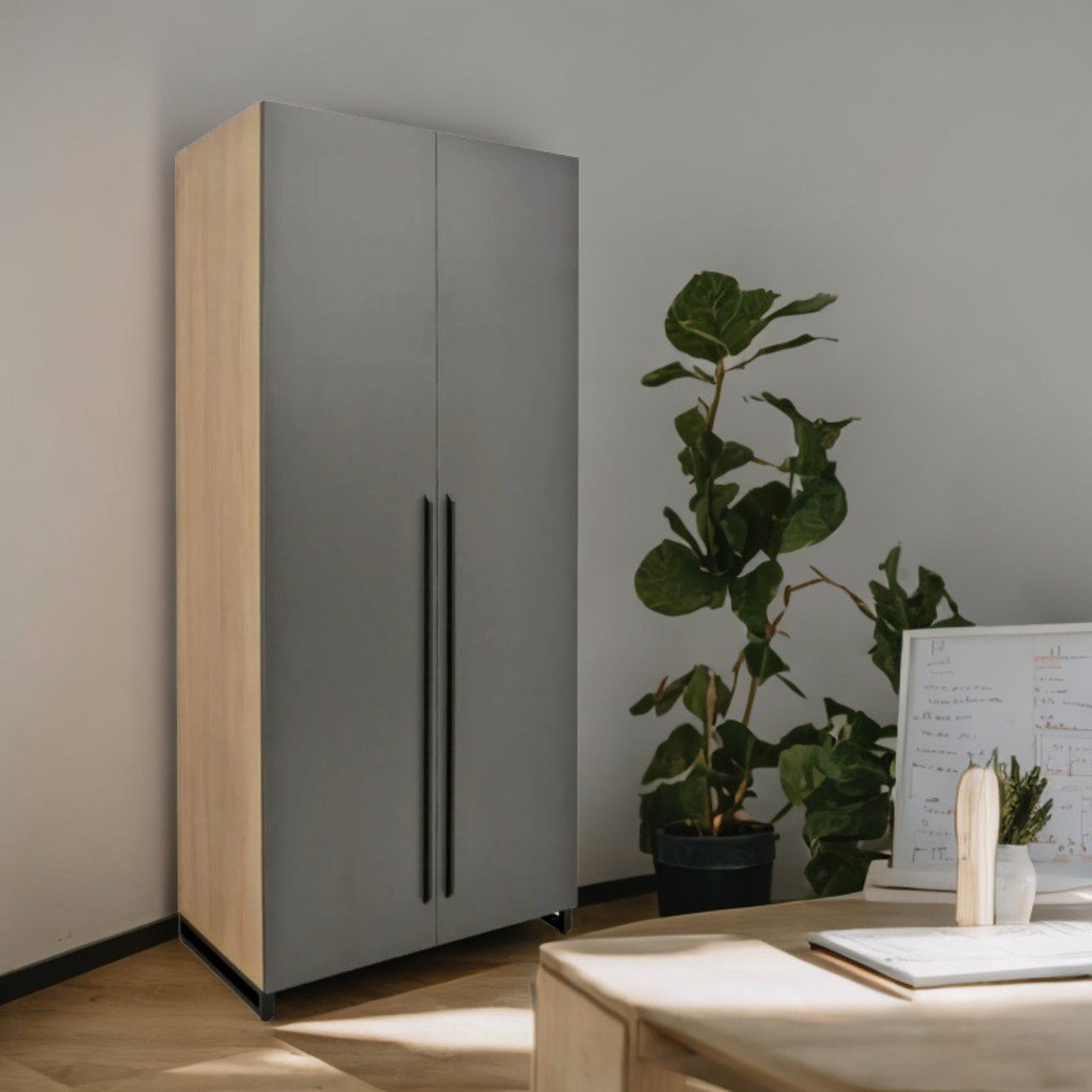 Размери (Д×Ш×В): 900×520×2100 мм. Шкаф от меламиново ПДЧ 18 мм, със завършена фасада с ABS кант 1 мм. Гърбът е изработен от бял меламин PFL с дебелина 3 мм. Гардеробът има 2 отделения с по 2 врати: първото отделение съдържа 5 рафта (2 рафта с разстояние 30 см между тях и 3 рафта с разстояние 32 см), а второто отделение е оборудвано с 2 рафта и овална хромирана закачалка. Частите са сглобени със сигурни крепежни елементи и са предназначени за стенен монтаж. Шкафът е оборудван с метални крака. Цвят: Антрацит, дъб сонома.