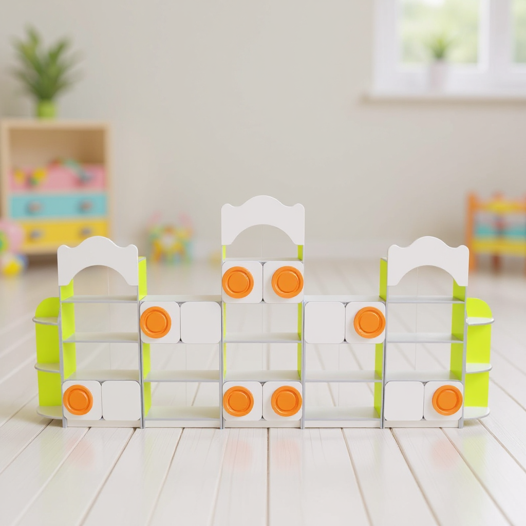 Размери (Д×Ш×В): 3600×300×1700 мм Тегло: 132,36 кг Весел и функционален комплект, идеален за образователни пространства или детски стаи. Изработена от 16 мм дебело ламинирано ПДЧ и завършена с 1 мм (лицеви) и 0,5 мм (вътрешни) ABS кантове, тази мебел предлага издръжливост и модерен външен вид. Комплектът съдържа 7 различни елемента, оборудвани с рафтове и шкафове с декоративни врати, със заоблени ъгли за безопасност. Ъгловите рафтове също са заоблени, което допринася за приятен и достъпен дизайн. Декориран с цветни MDF апликации, комплектът придава закачлива и приятна нотка на стаята. Всяка част е сглобена със специални крепежни елементи и е снабдена с издръжливи пластмасови уплътнения. Комплектът се закрепва към стената, за да се гарантира безопасността на децата. Преобладаващи цветове: лайм зелено, жълто Гаранционен срок: 24 месеца