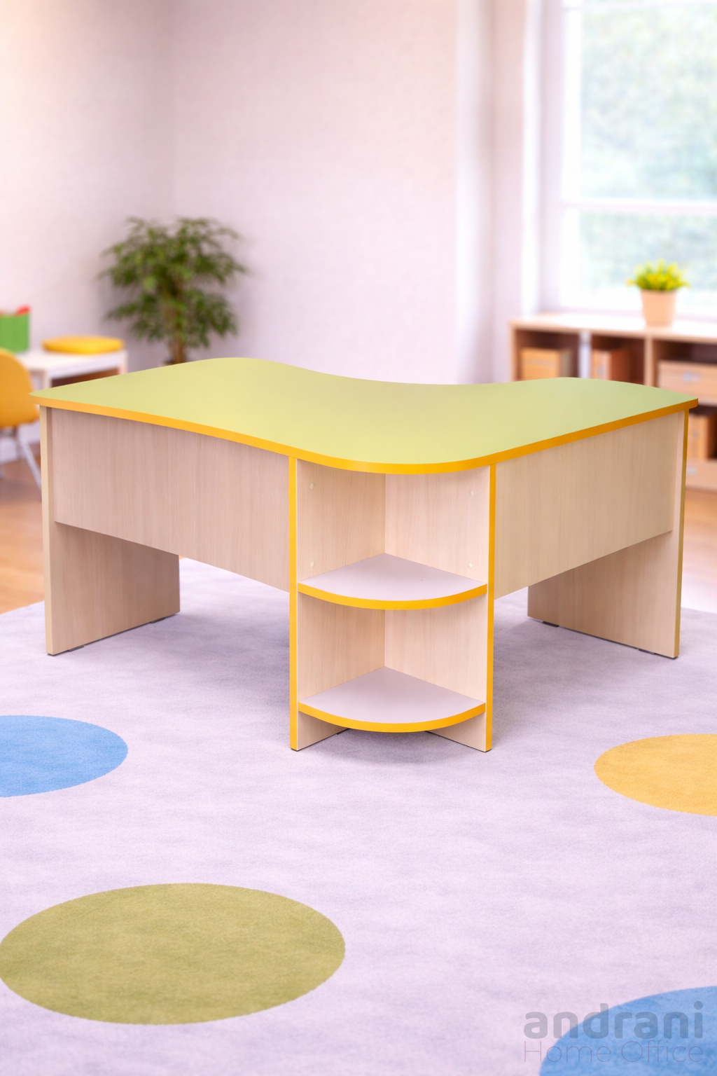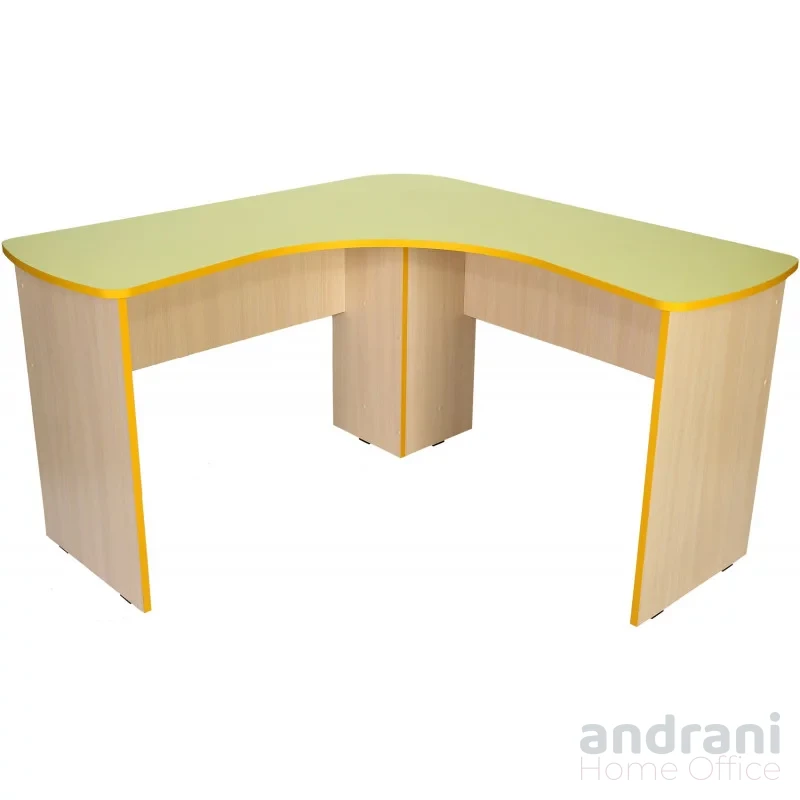 Маса 1300х1300х750 мм + шкаф 400х400х590 мм, меламиново ПДЧ 18/16 мм, ABS кант 1 мм, заоблени ъгли, отворени рафтове. По избор: подвижен шкаф с 3 чекмеджета / 2 отворени рафта / 2 затворени рафта. Цвят: плот жасмин, рамка светъл дъб, фасади лавандула.