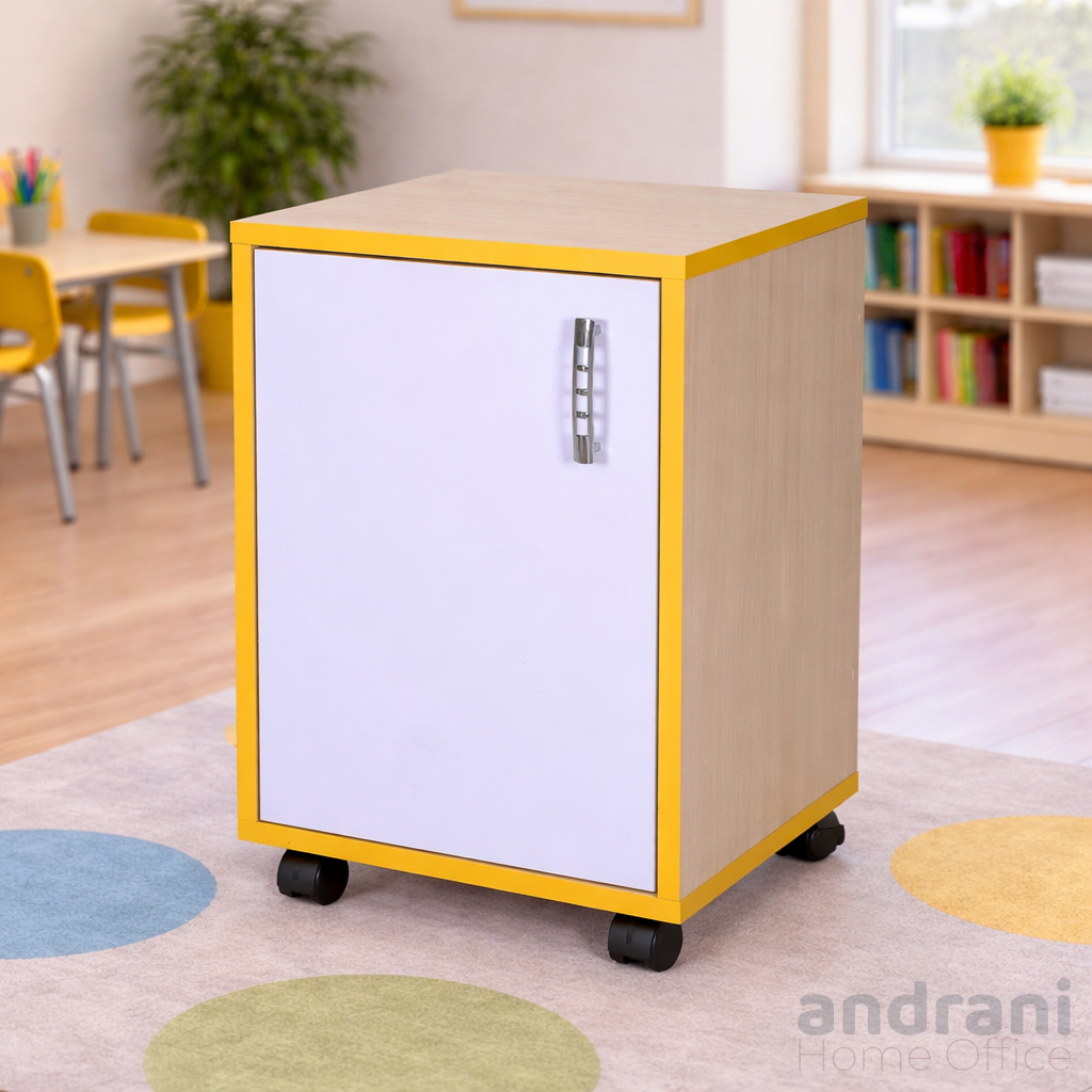 Размери (ДxШxВ): 400 x 400 x 590 мм Тегло: 18 кг Кабинет за учител, идеален за класни стаи, оборудван с врата. Корпусът е изработен от 16 мм меламиново ПДЧ цвят светъл дъб. Вратата е изработена от 16 мм меламиново ПДЧ цвят лавандула. Детайлите са завършени с 1мм меламинова PVC лента. Закопчалките имат декоративен защитен слой. Шкафът е монтиран на колела за лесно преместване. Цветове: светъл дъб, лавандула