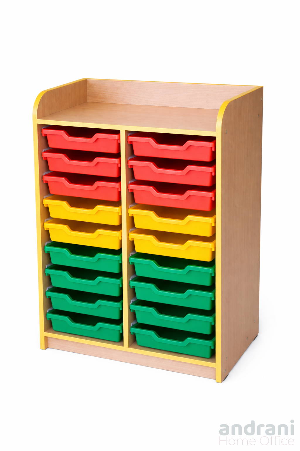 Размери (ДxШxВ): 696 x 410 x 937 мм Тегло: 21,50 кг Шкаф от 16мм меламиново ПДЧ, с 3мм бял меламинов PFL гръб. Фасадата е завършена с 1 мм жълт ABS кант. Включва 16 пластмасови кутии в жълто, червено и зелено, плюс горен рафт за допълнително съхранение. Безопасен монтаж със специални елементи, закрепени към стената за безопасността на децата. Издръжливи пластмасови уплътнения. Цветове на корпуса: бук, светъл дъб Кутии включени в цената