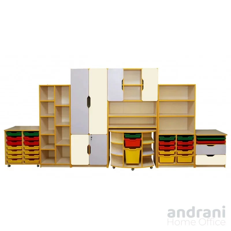 Този многофункционален мебелен комплект е идеално решение за детски градини, училища, занимални или детски стаи, където е необходимо ефективно организиране на голям обем материали и принадлежности.
