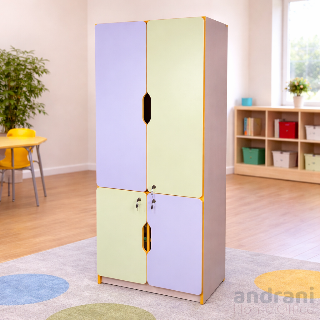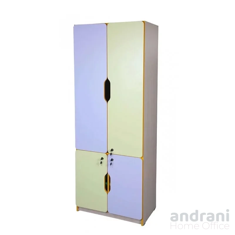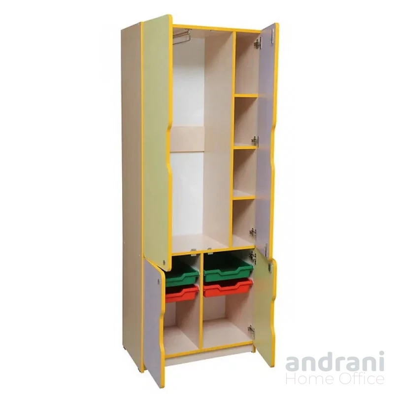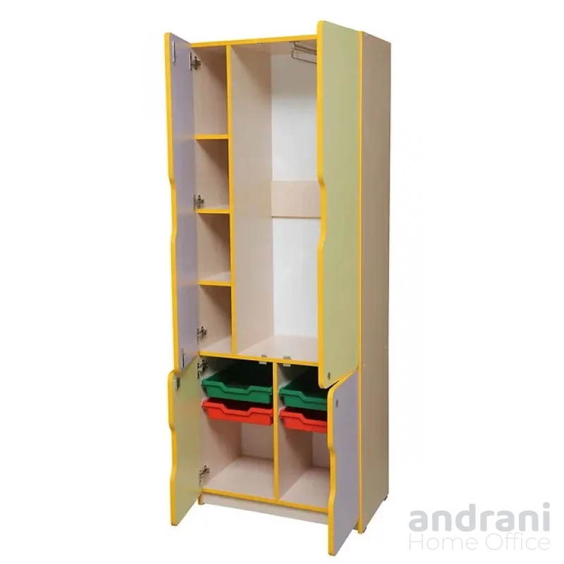 Шкаф - размери: 696×410×1885 мм, тегло: 56,49 кг. Меламиново ПДЧ 16 мм, гръб бял PFL 3 мм. Жълта фасада с ABS кант 1 мм. Интериор със закачалка и 4 рафта. Включва 4 пластмасови кутии Gratnells N1 (зелена и червена). Врати със заоблени ъгли и изрез за отваряне. Корпус: светъл дъб. Фасади: жасмин/лавандула. Сигурно закрепване, монтаж със специални елементи.