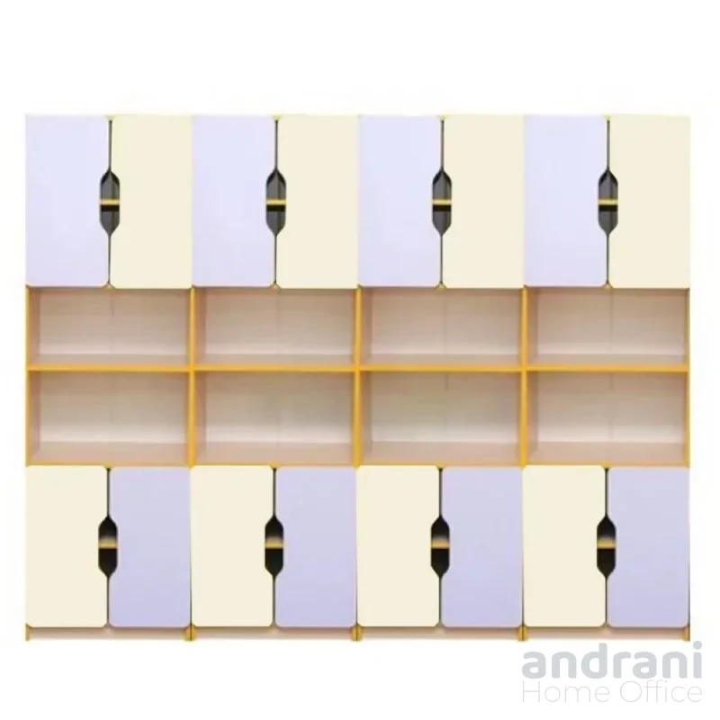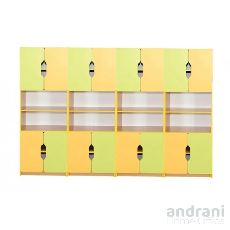 Размери (ДxШxВ): 2400 x 410 x 1885 mm Мебели от 16 мм ЛПДЧ, с 3 мм бял меламинов гръб PFL. Фасадите са завършени с 1 мм жълт ABS кант, а интериорните елементи с 0,5 мм жълт ABS кант. Структура: Комплектът се състои от 4 отделения. Всяко отделение съдържа 2 отворени ниши и 4 затворени рафта, предлагащи щедро пространство за организация. Вратите са със заоблени ъгли и интегрирана дръжка за отваряне. Мебелите се сглобяват със специални крепежни елементи и се монтират на стената за безопасността на децата. Включва издръжливи пластмасови уплътнения. Налични цветови комбинации: Корпус: светъл дъб / Чела: лавандула, крем Корпус: бук / Чела: жълто, лайм зелено