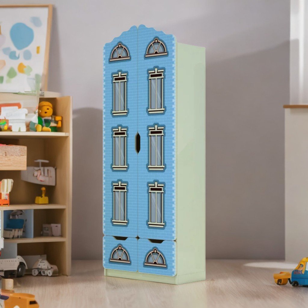 Шкаф с две врати, изработен от 16 мм меламиново ПДЧ, със задна стена 3 мм бял меламин PFL. Фасадата е завършена с ABS кант 1 мм, а вътрешните елементи с кант 0,5 мм. Вътрешността е разделена на две отделения: едното с куки за дрехи, другото с рафтове. Вратите са със заоблени ъгли и са декорирани с фотопечат, който пресъздава фасадата на сграда с прозорци, врати и покрив, защитени с нетоксичен акрилен лак на водна основа - устойчив на надраскване и мокро почистване. Шкафът е оборудван с издръжливи пластмасови уплътнения, сигурни крепежни елементи и система за стенен монтаж за безопасност на децата. Размери: 800 x 320 x 2030 мм. Цвят на тялото: крем. Фасада: фотопечат. Гаранция: 24 месеца.
