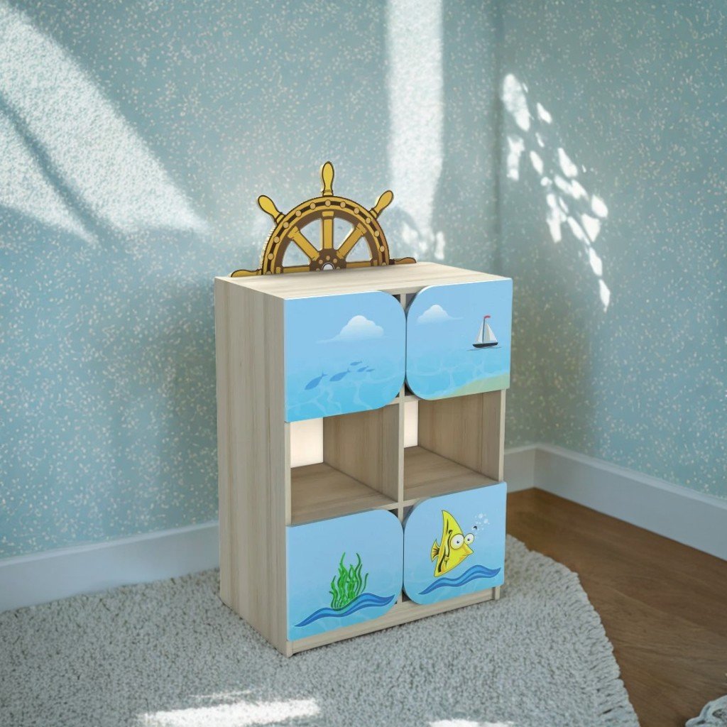 Този шкаф с размери 702×400×1070(1380) mm е изработен от меламиново ПДЧ с дебелина 18 mm, с 3 mm бял меламинов PFL гръб. Фасадата, завършена с 1 мм ABS кант, включва два отворени рафта и четири затворени рафта, вратите са с декоративен дизайн със специални изрези за лесно отваряне. Вратите са декорирани с влагоустойчив фотопечат с изображения на морска тематика, а горната част е декорирана с декоративен елемент във формата на кормило, изработен от ПДЧ 16 мм. Шкафът е сглобен със сигурни крепежни елементи, а корпусът е завършен в занаятчийски перлен бук. Направете заявка до ChatGPT