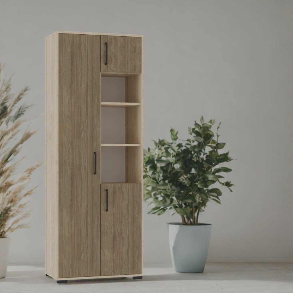 Размери (Д×Ш×В): 719×405×2025 mm. Шкаф от 18мм ЛПДЧ. Отпред с 1мм ABS кант, 0,5мм вътрешен. Гръб в бял меламин PFL с дебелина 3 мм. Включва 7 затворени и 3 отворени рафта, някои с с регулируема височина а височина. Сглобява се със специални и сигурни крепежни елементи, предназначени за стенен монтаж. Снабден с пластмасови крачета. Цвят: занаятчийска перла, кафяв градски дъб.
