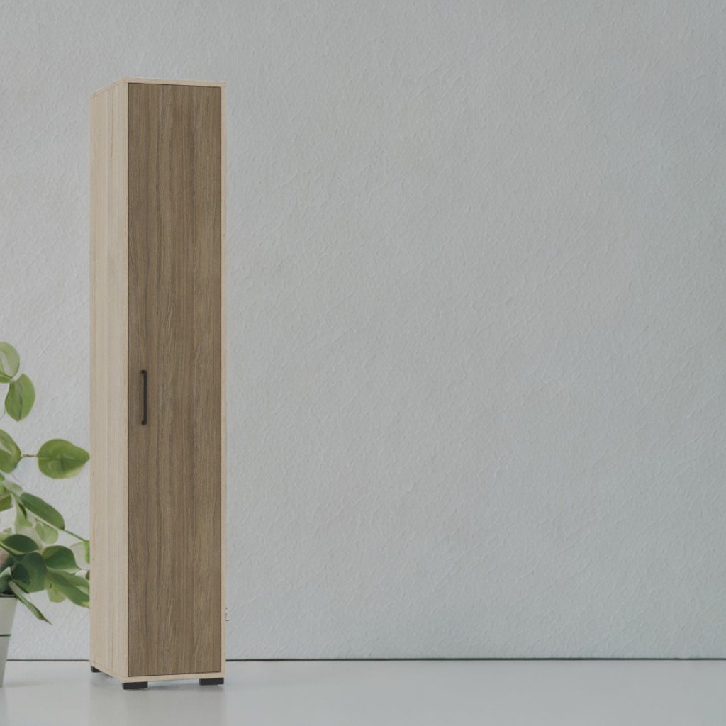 Размери (Д×Ш×В): 360×405×2025 мм. Шкафът е изработен от ЛПДЧ с дебелина 18 мм. Фасадата е завършена с ABS кант 1 мм, а вътрешните части с кант 0,5 мм. Гърбът на шкафа е изработен от бял меламин PFL с дебелина 3 мм. Шкафът съдържа 5 рафта, 3 от които са с с регулируема височина а височина. Частите се сглобяват със специални и безопасни крепежни елементи, предвидени за стенен монтаж. Шкафът е оборудван с пластмасови крака. Налични цветове: занаятчийска перла, кафяв градски дъб.