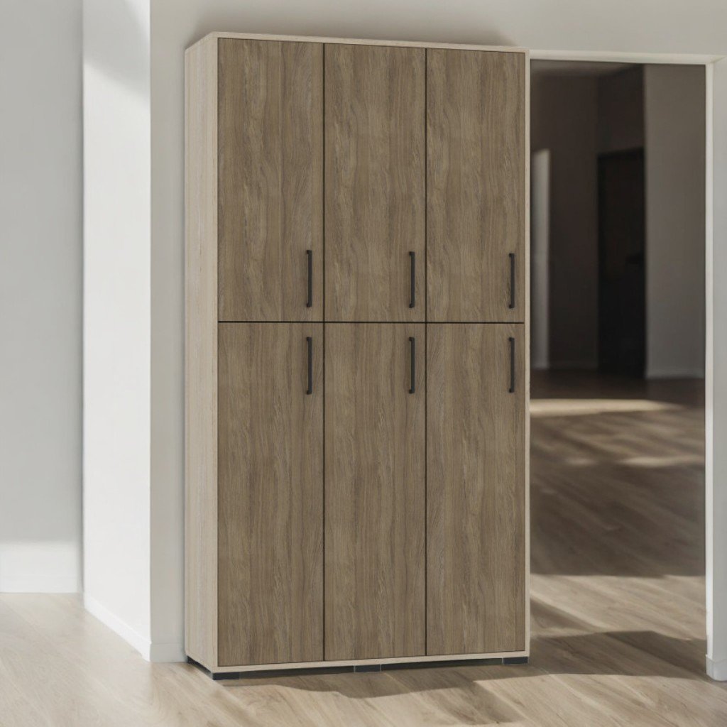 Гърбът на шкафа е изработен от бял меламин PFL, с дебелина 3 мм, осигуряващ стабилност и спретнат външен вид. Отделението е практично: гардеробът е разделен на 6 отделни секции, всяка снабдена с две куки за закачане.