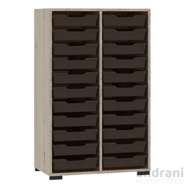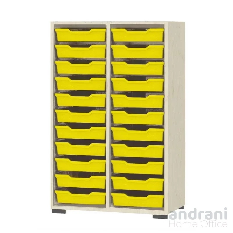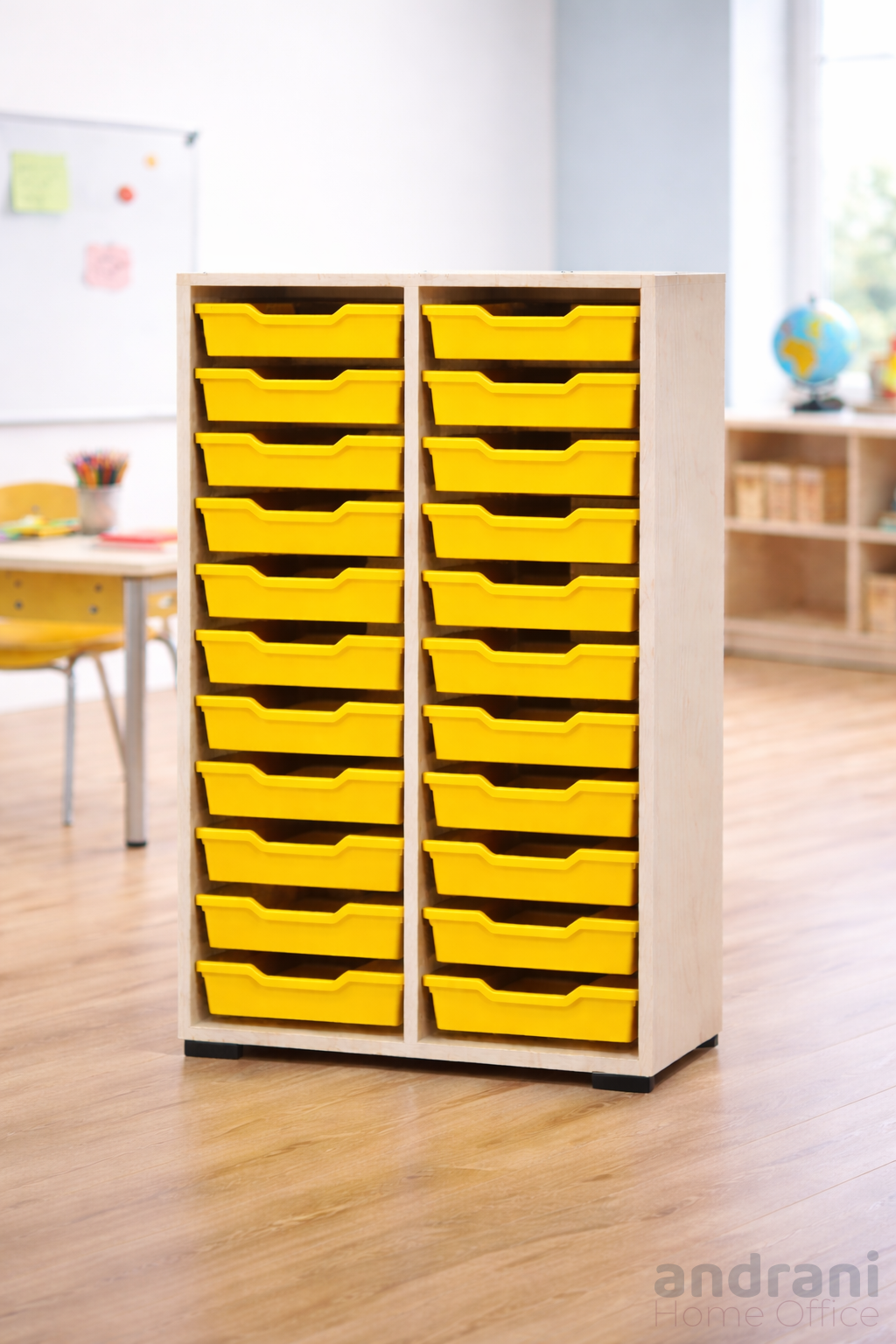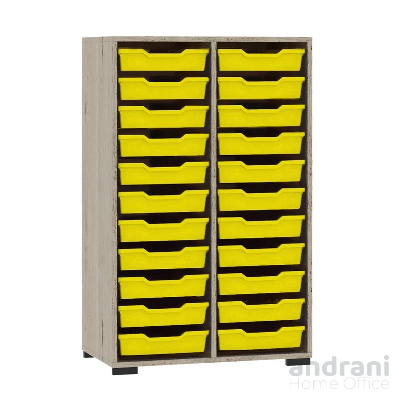 Шкафът включва 22 пластмасови кутии Gratnells N1 в жълт и кафяв цвят, които са идеални за съхранение на учебни материали, играчки, инструменти или офис консумативи.