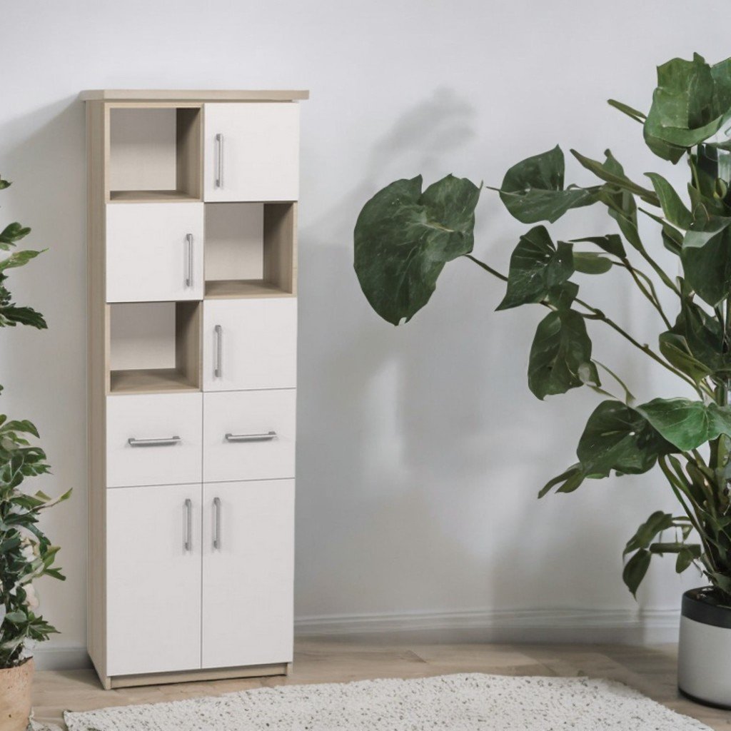 Полузатворен шкаф - размери: 702×405×2115 мм. Изработен от 18 мм меламиново ПДЧ, 2,5 мм HDF гръб. Разполага с 5 затворени рафта, 3 отворени рафта и 2 чекмеджета на телескопични водачи с пълно изтегляне. Рафтът се регулира на височина. Корпус: Artisan Pearl (ABS 0,5 mm), Фасади: светло сиво (ABS 1 mm). с регулируема височина и метални крачета (0–30 mm) за неравни подове. Сглобен със сигурни крепежни елементи, предназначен за стенен монтаж.