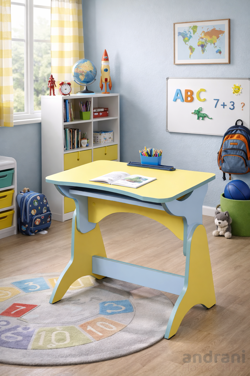 Детска маса с регулируема височина за деца 1–3 години. Вграден рафт, безопасен меламинов плот с ъглово регулиране, отделение за химикалки и весели цветове.
