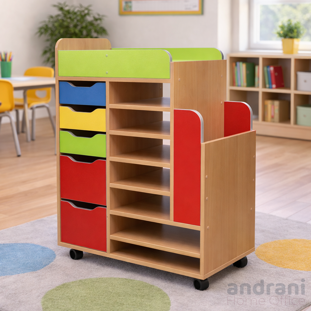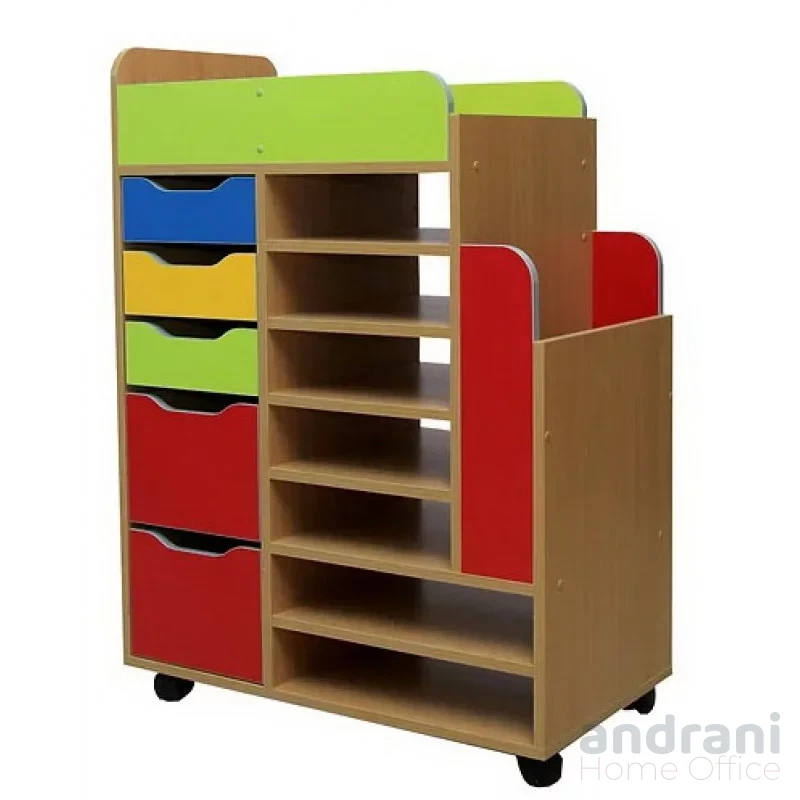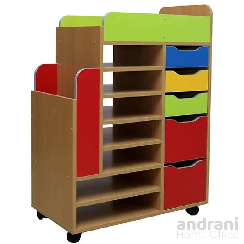 Този мобилен шкаф с рафтове и чекмеджета е функционално решение за организация на учебни материали, играчки и пособия в детски градини, училища и занимални. С размери 1010 × 400 мм и компактна конструкция, той осигурява удобен достъп и ефективно използване на пространството.