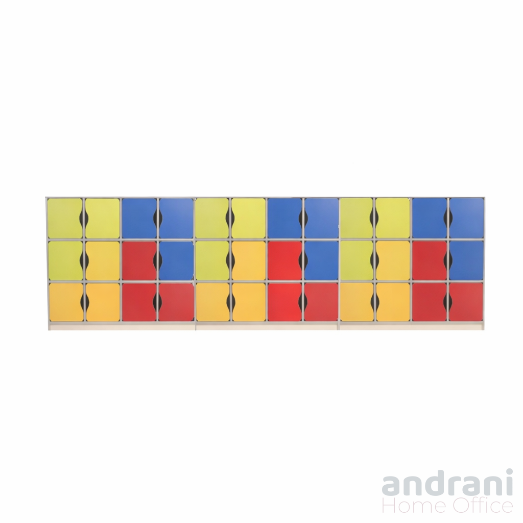Размери (ДxШxВ): 3888 x 350 x 1040 mm Тегло: 171 кг Комплектът е изработен от 16 мм меламиново ПДЧ, като задна стена е 3 мм бял меламинов PFL. Фасадите и интериорните елементи са завършени със сребрист ABS кант (1 мм и 0,5 мм). Включва 36 рафта с цветни врати със заоблени ъгли и специални изрези за отваряне. Мебелите се сглобяват със сигурни крепежни елементи и могат да се фиксират към стената за безопасност на децата. Снабден с издръжливи пластмасови уплътнения. Цветове: жълто, лайм зелено, червено, синьо, бежово