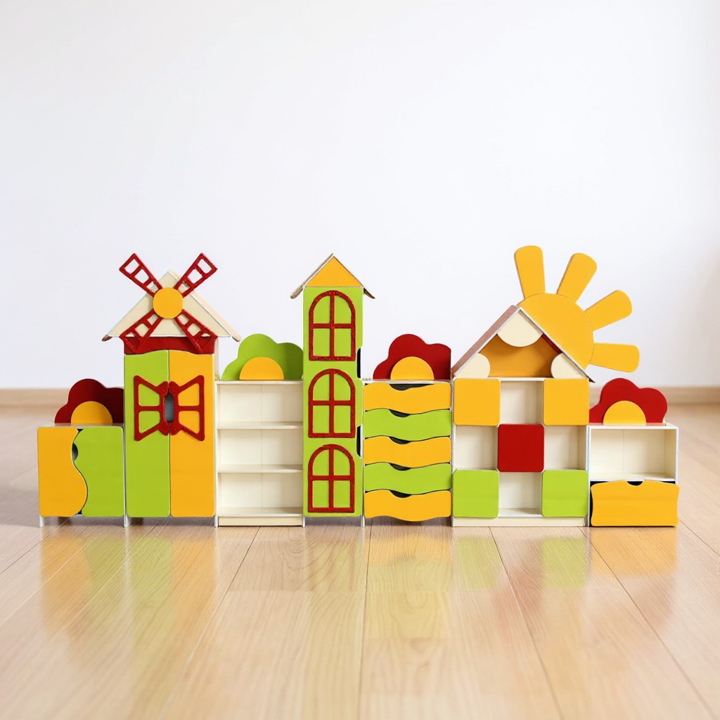 Размери (ДхШхВ): 4310х320х1834 мм Тегло: 295.24 кг Мебелите са изработени от 16 мм ЛПДЧ, със задна стена 3 мм бял меламин PFL. Фасадата е завършена с 1мм ABS кант, а вътрешните части с 0,5мм ABS кант и двете в сребрист цвят. Шкафовете имат врати със заоблени ъгли, специално място за отваряне и са декорирани с тематични мотиви: цвете, слънце, мелница и къща. Комплектът се състои от 7 отделения и включва отворени и затворени рафтове, чекмеджета и подвижно чекмедже на ролки. Монтажът е направен с безопасни крепежни елементи и е оборудван със система за закрепване към стената за защита на децата. Мебелите са оборудвани с издръжливи пластмасови уплътнения за защита на пода. Цветове: жълто, лайм зелено, бежово, червено. Гаранция: 24 месеца.