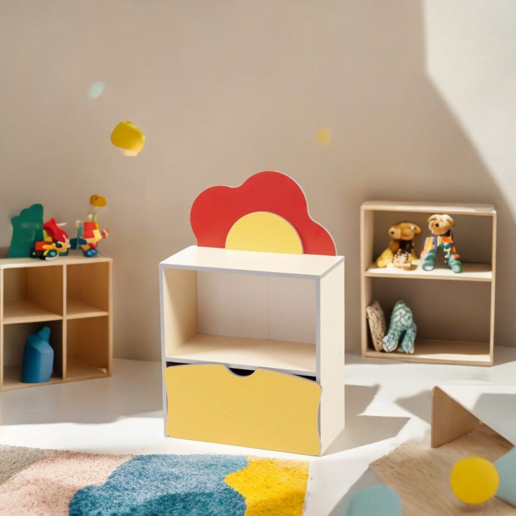 Размери (Д x Ш x В): 600 x 300 x 957 mm Тегло: 18.80 кг Шкафът е изработен от меламиново ПДЧ с дебелина 16 мм, а задната стена е от бял меламинов PFL, с дебелина 3 мм. Фасадата е завършена с 1 мм сребрист ABS кант. Разполага с отворен рафт и подвижно чекмедже на ролки със заоблени ъгли, декоративни детайли и изрязана дръжка за лесно отваряне. Дизайнът е завършен от декоративен елемент във формата на цвете, а частите са сглобени със специални и сигурни закопчалки. Шкафът е фиксиран към стената, за да се осигури защитата на децата и е оборудван с издръжливи пластмасови уплътнения. Цветове: жълто, червено, бежово Гаранция: 24 месеца