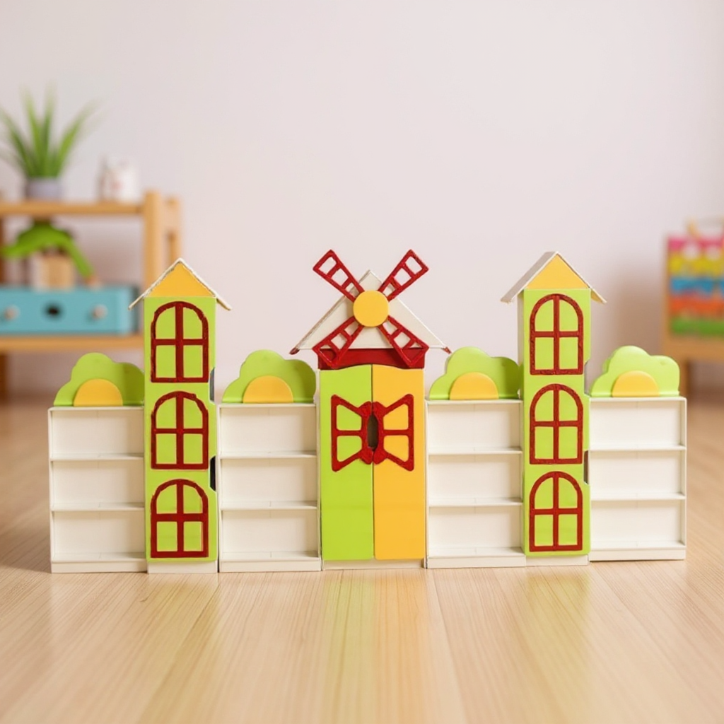 Комплектът е с размери 3800 × 320 × 1776 mm и е изработен от ламинирано ПДЧ с дебелина 16 mm със задна стена от 3 mm бял меламин PFL. Фасадите са завършени с 1мм ABS кант, а вътрешните с 0,5мм кант и двете в сребрист цвят. Състои се от 7 отделения, мебелите включват отворени и затворени рафтове с декоративни заоблени врати и вдлъбнатини за отваряне. Елементите се сглобяват със сигурен хардуер и се фиксират към стената за стабилност. Дизайнът е завършен от цветни MDF апликации – цвете, мелница, кула – които придават закачлив характер на парчетата. Мебелите са оборудвани с издръжливи пластмасови уплътнения и се предлагат в жълто, зелено, бежово и червено. Гаранционният срок е 24 месеца.
