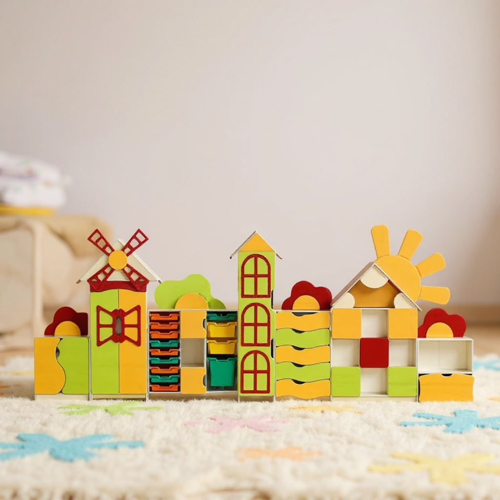 Размери (ДхШхВ): 4683х320х1834 мм. Мебелите са изработени от ЛПДЧ с дебелина 16 мм. Задната стена е от бял меламин PFL с дебелина 3 мм. Фасадата е облепена с 1мм ABS кант сребрист цвят. Вътрешните части са облепени с ABS кант 0,5 мм, сребрист цвят. Комплектът се състои от 7 отделения и съдържа чекмеджета, затворени и открити рафтове, подвижно чекмедже на ролки и пластмасови кутии за съхранение. Шкафовете имат врати със заоблени ъгли, специално място за отваряне и са украсени със специфични елементи: цвете, слънце, мелница, къща. Частите се сглобяват със специален и безопасен обков. Комплектът е оборудван със система за стенен монтаж за безопасност и с издръжливи пластмасови уплътнения за защита на пода. Цвят: жълто, лайм зелено, бежово, червено. Гаранционен срок: 24 месеца.