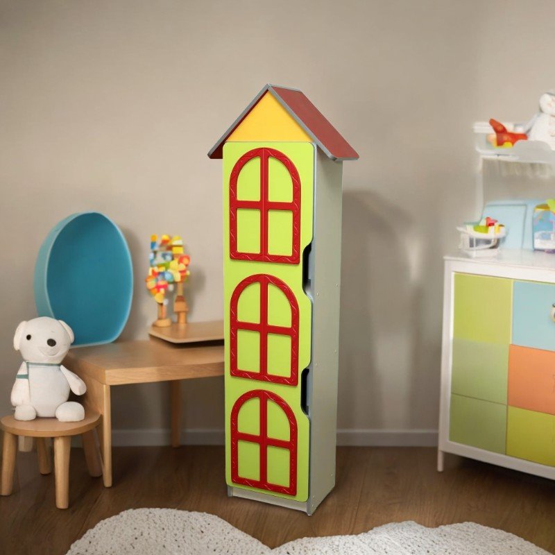 Размери (Д x Ш x В): 400 x 320 x 1776 mm Тегло: 18.80 кг Шкафът е изработен от меламиново ПДЧ с дебелина 16 мм, а задната стена е от бял меламинов PFL с дебелина 3 мм. Фасадата е завършена с 1мм ABS кант, а вътрешните части са облепени с 0,5мм ABS кант - и двете в сребрист цвят. Дизайнът на изделието е вдъхновен от формата на кула, декорирана с цветни МДФ апликации, които включват стилизирани "прозоречни" елементи. Шкафът включва 5 просторни рафта и врата със заоблени ъгли, оборудвана със специален изрез за лесно отваряне. Всички компоненти са сглобени посредством специални и безопасни системи за закрепване, а шкафът е снабден с издръжливи пластмасови уплътнения. За безопасността на децата е закрепен към стената. Цветове: жълто, лайм зелено, червено, бежово Гаранция: 24 месеца