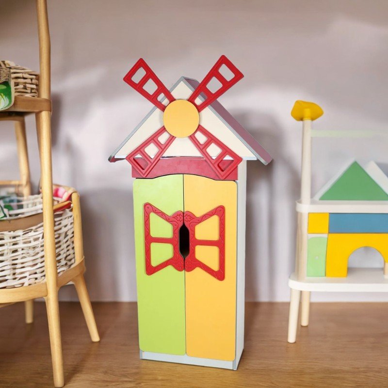 Размери (Д x Ш x В): 600 x 320 x 1776 мм Шкафът е изработен от меламиново ПДЧ с дебелина 16 мм, със задна стена от бял меламинов PFL с дебелина 3 мм. Фасадата е завършена с 1 мм ABS кант, а вътрешните части са снабдени с 0,5 мм ABS кант – и двете в сребристо за издръжливост и еднакъв външен вид. Шкафът включва 4 просторни рафта и врати със заоблени ъгли, оборудвани със специални изрези за лесно отваряне. Вратите са декорирани с цветни МДФ апликации, представящи елементи от рустикалното вдъхновение, характерно за мелницата. Частите се сглобяват чрез специални и безопасни системи за закрепване, а шкафът може да се прикрепи към стената, за да се гарантира безопасността на децата. Продуктът е оборудван и с издръжливи пластмасови уплътнения, предназначени да предпазват компонентите във времето. Цветове: жълто, лайм зелено, червено, бежово Гаранция: 24 месеца