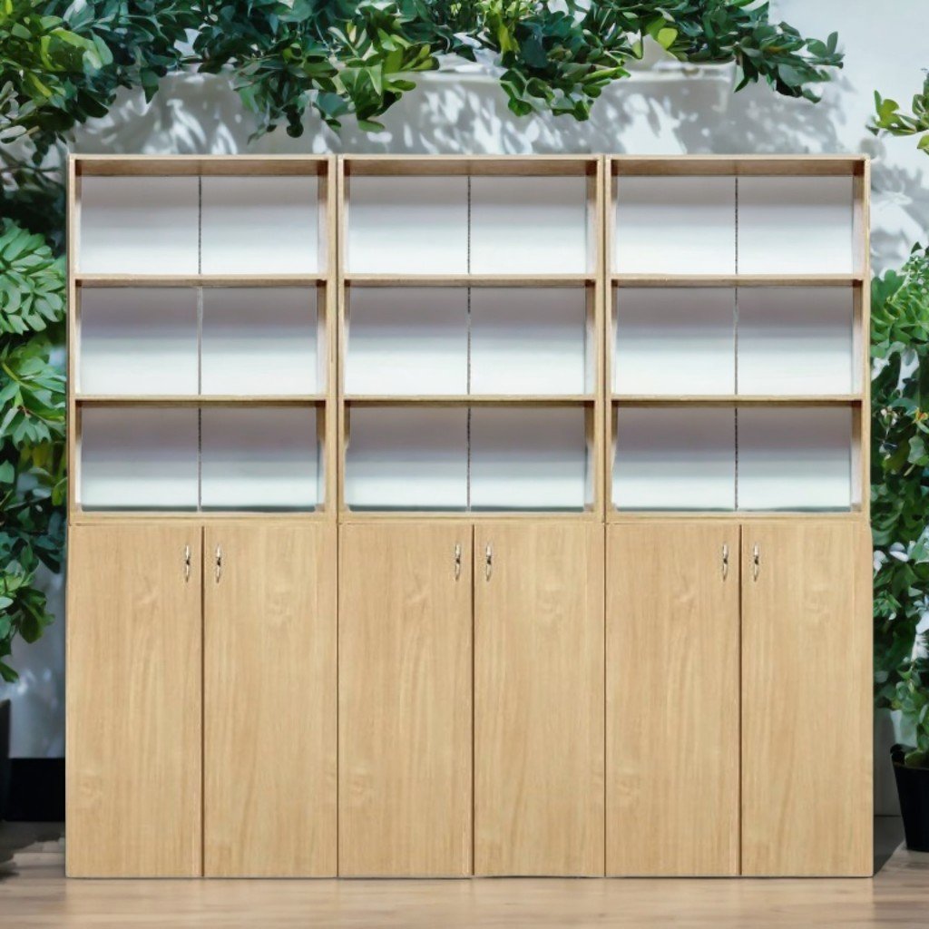 Размери (Д×Ш×В): 2400×400×2200 мм. Комплект мебели от меламиново ПДЧ с дебелина 18 мм. Фасадите са завършени с ABS кант 1 мм, а вътрешните части с кант 0,5 мм. Гърбът е изработен от бял меламин PFL с дебелина 3 мм. Комплектът се състои от 3 отделения, всяко с 3 ниши и 3 затворени рафта. Оборудван е с хромирани дръжки, с регулируема височина и пластмасови крачета и всички шкафове са фиксирани заедно с дървени дюбели. Монтажът се извършва със специални и безопасни крепежни елементи. Налични цветове: бук, светъл дъб, занаятчийски перлен бук, сив.