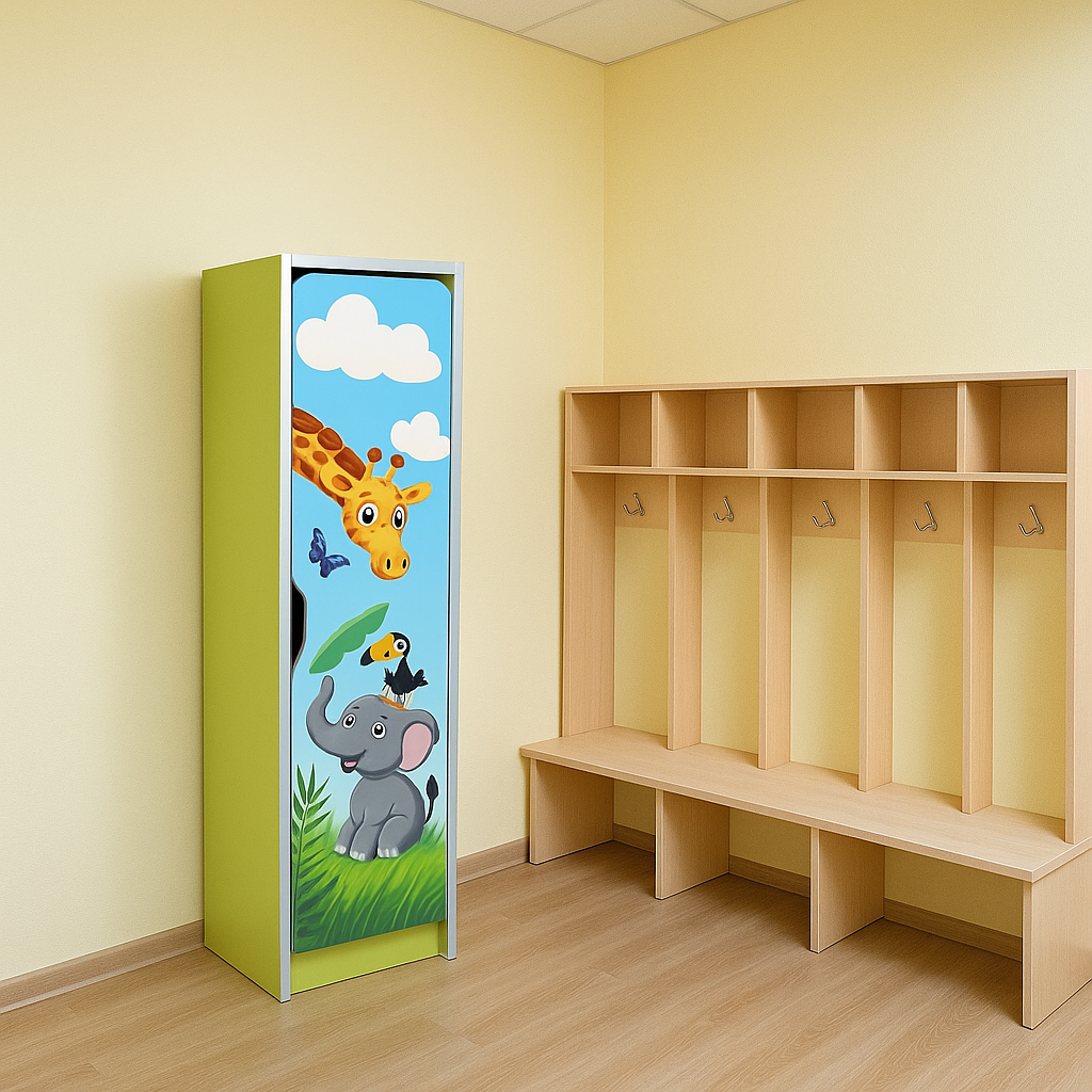 Съблекалнята е изработена от 16 mm меламиново ПДЧ, със задна стена от 3 mm PFL, което е идеално за образователни пространства. Фасадата е завършена с 1мм ABS кант, а вътрешните части с 0,5мм кант и двете сребристи. Декоративната врата е със заоблени ъгли и ергономичен отвор, като е покрита с тематичен фотопечат - сафари животни - водоустойчиви. Отделението включва вътрешен рафт, две хромирани кукички и допълнителен рафт отгоре. Шкафът е сглобен със сигурни крепежни елементи, фиксирани към стената за стабилност и снабдени с издръжливи пластмасови уплътнения. Рамката е зелена липа, а фасадата е цветна и илюстрирана. Размери: 322 x 350 x 1400 mm | Тегло: 22,88 кг | Гаранция: 24 месеца