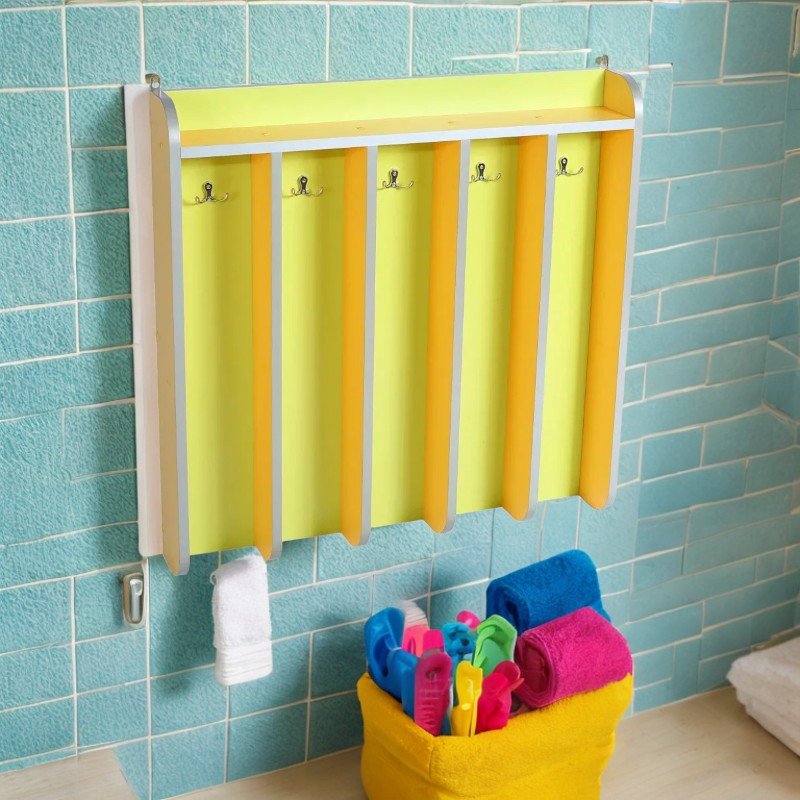 Има заоблени ъгли за безопасност и рафт отгоре за допълнително съхранение. Всички части са фиксирани със специални и сигурни крепежни елементи. Закачалката се закача за стената, като по този начин осигурява стабилност и защита на децата.