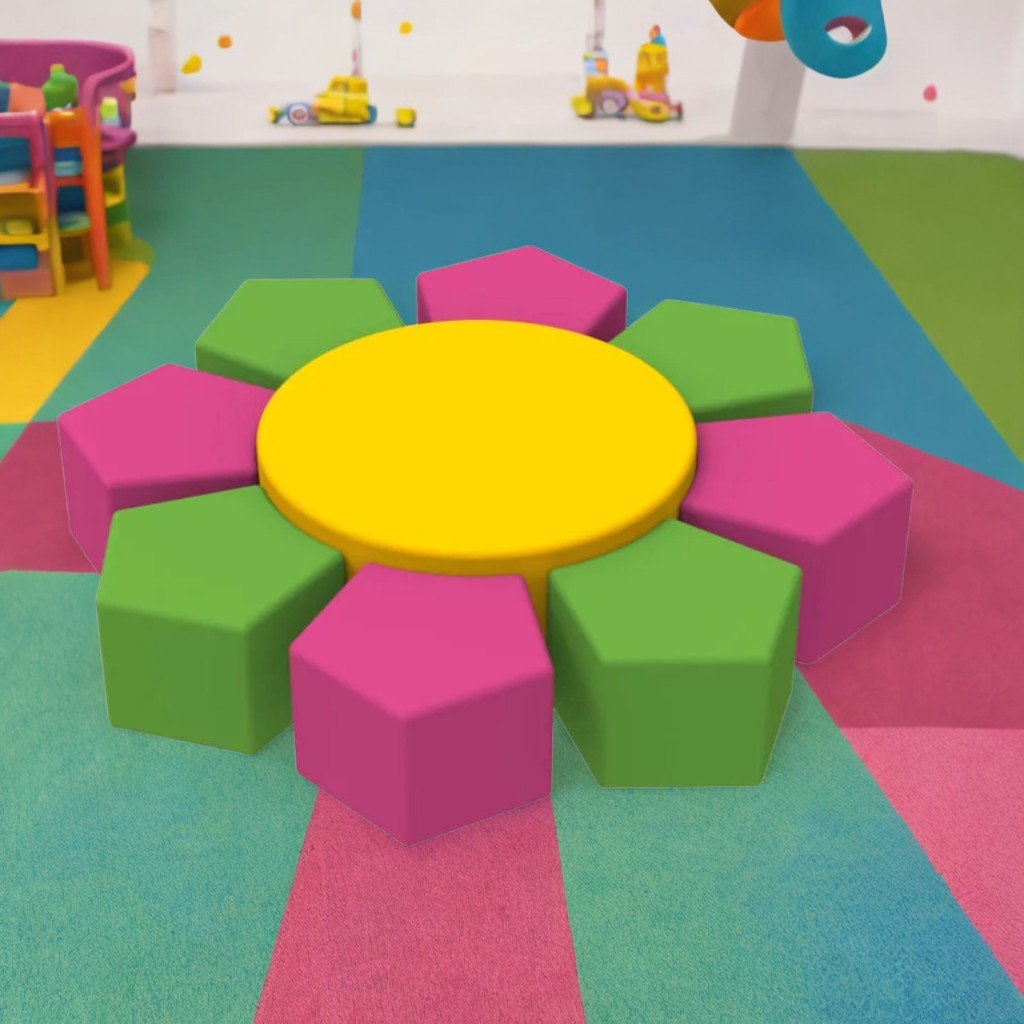Комплект пуф "Camellie" с 9 разноцветни елемента във формата на цвете, идеален за атрактивни кътове за игра. Стимулира логиката и креативността на децата, с леко тегло за лесно боравене и безопасни ръбове без твърди ъгли. Издръжлив, хипоалергичен, не абсорбира миризми и влага, не избледнява и се почиства лесно. Плътност на порест каучук 22 kg/m³. Материал PVC/еко кожа. Размери 130×130×35 см, тегло 60,3 кг, обем 0,6 м³. Цветове: бяло-зелено-лилаво, жълто-червено-синьо-зелено, розово-зелено-жълто, зелено-жълто-лилаво. Препоръчва се за интериор; навън само при сухо време. Почиствайте с нормални препарати, без хлор или разтворители.