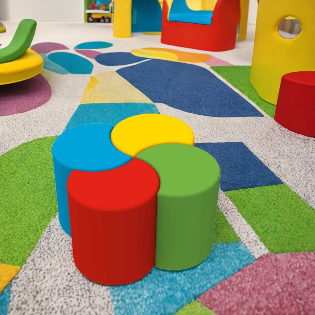 Комплект големи пуфове "Полумесец" състоящ се от 4 разноцветни елемента във формата на полумесец, които позволяват създаването на различни форми. Развива сръчността и изобретателността на децата. Леко тегло за лесно преместване от деца. Липсата на остри ъгли гарантира безопасност при игра. Издръжлив, хипоалергенен, не задържа миризми и влага, устойчив на слънце и замърсяване. Плътност на порест каучук 22 kg/m³, материал PVC плат/екологична кожа. Размери 96x96x35 см, тегло 6,7 кг, обем 0,34 м³. Цветове: бяло-жълто-зелено-лилаво, жълто-червено-синьо-зелено, розово-жълто, лилаво-жълто. Препоръчва се за сухи и проветриви помещения, използва се навън само при сухо време. Не се намокря и не остава мокър след почистване. Почиствайте с обикновени домакински препарати, без хлор или разяждащи химикали.