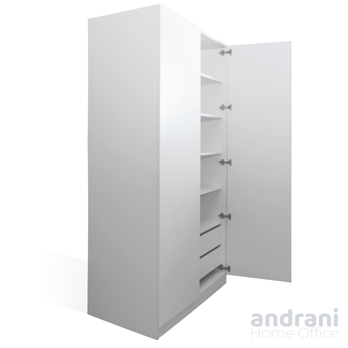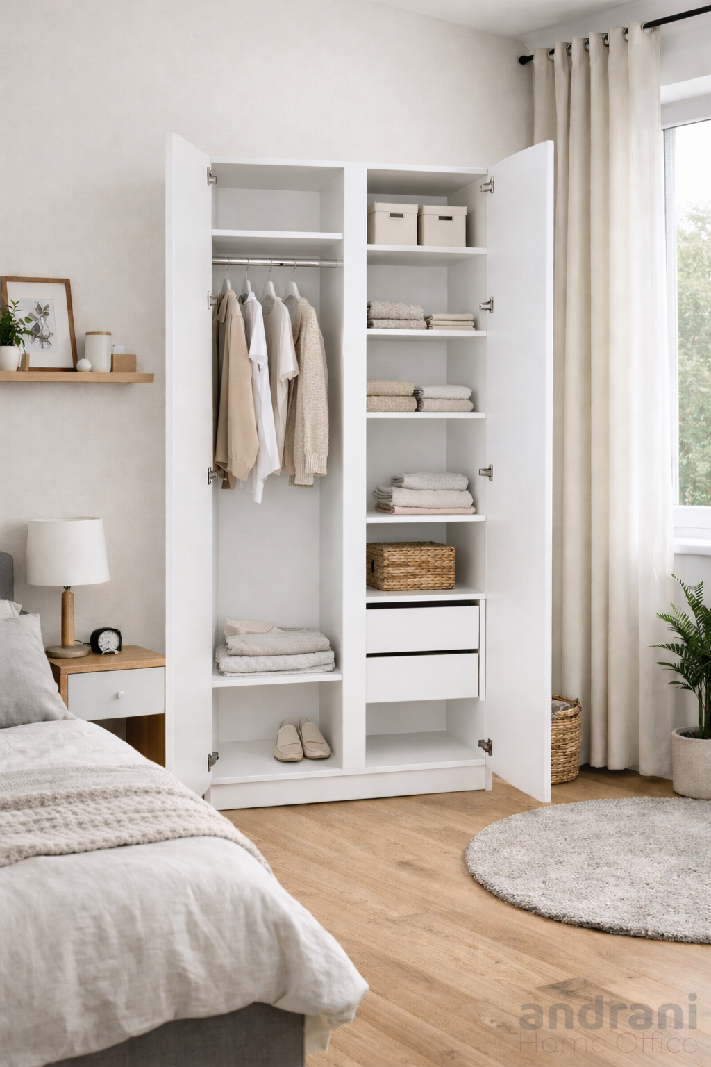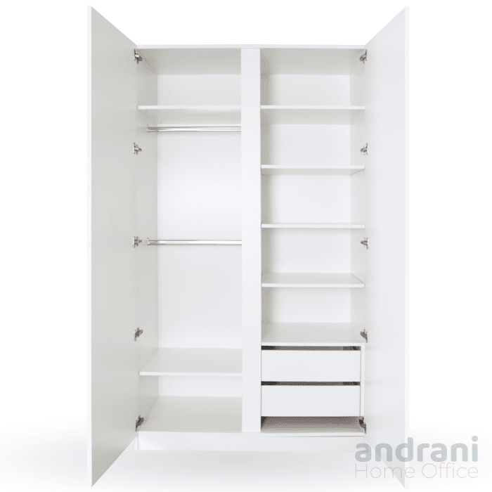 Функционалното вътрешно разпределение включва лост за закачалки, практични чекмеджета за обувки и отделни зони за подреждане на сгънати дрехи. Това позволява лесна организация и максимално оползотворяване на наличното пространство.