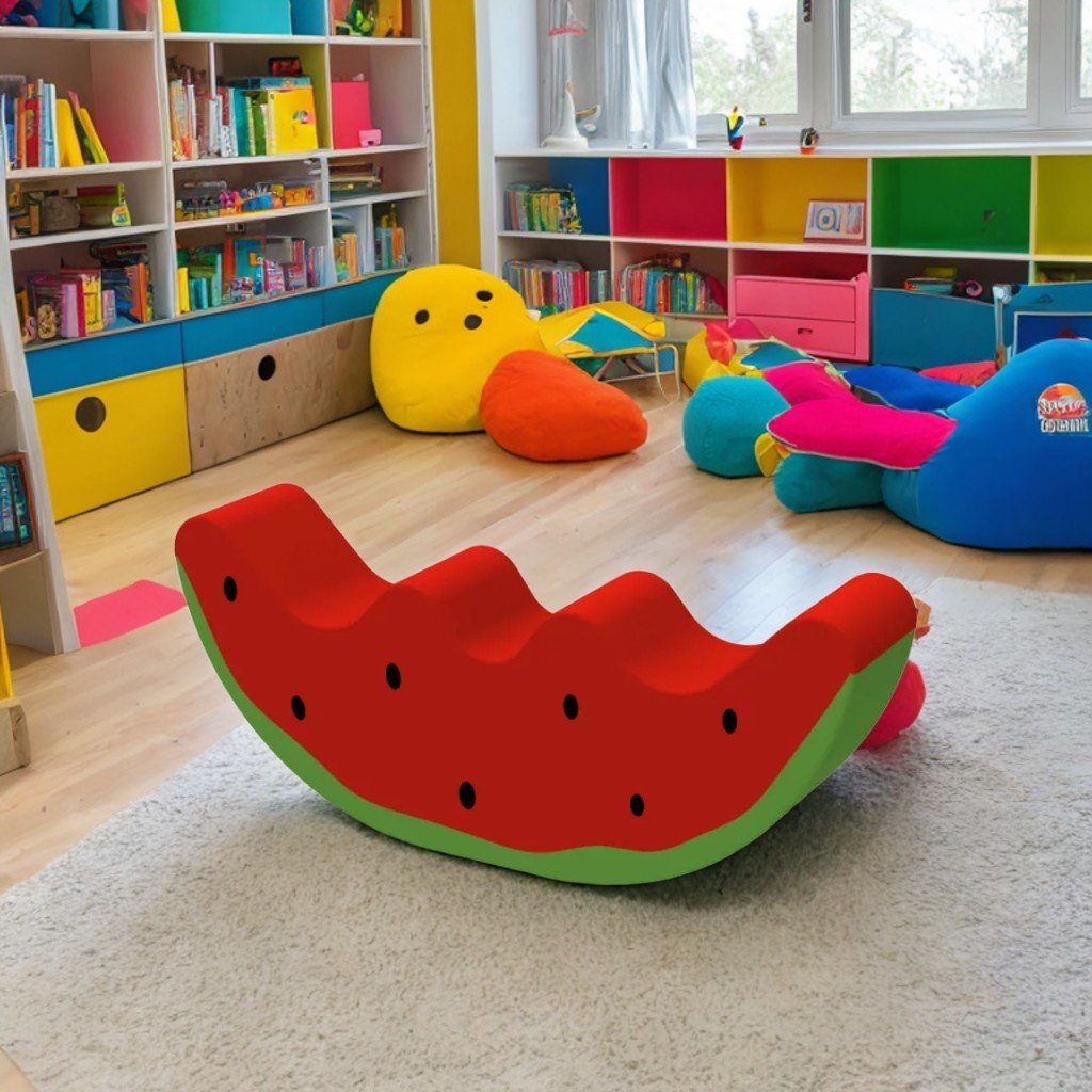 Люлката "Диня" е предназначена за люлеене на до четири деца и стимулира развитието на двигателните умения, вестибуларните функции и укрепва мускулите. Подходящ за домашна употреба и образователни, развлекателни и здравни заведения. Размери: 120x25x47 см, обем 0,141 м³, тегло 4,5 кг. Материал: екологична кожа/PVC дамаска, плътност на порест каучук 22 кг/м³. Употреба: в сухи и проветриви помещения, без овлажняване и мокро съхранение. Поддръжка: почиства се с обикновени домакински препарати, без хлор и агресивни вещества.