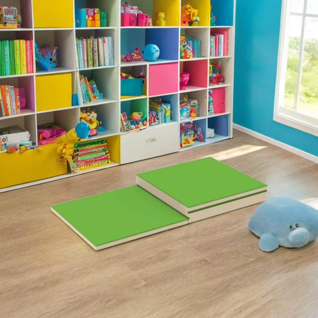 Сгънатата постелка за фитнес предпазва детето от падане и натъртвания. Подходящ за домашна употреба и образователни, развлекателни и здравни заведения. Плътността на порестия каучук е 22 kg/m³.