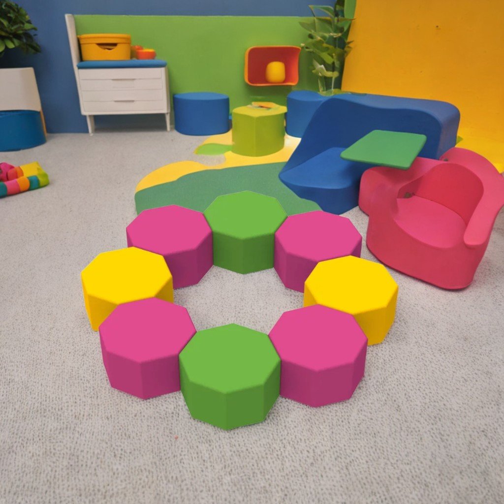 Комплект пуфове "Opt" състоящ се от 8 разноцветни пуфове. Децата могат да скачат и да играят на тях. Комплектът насърчава сръчността и изобретателността. Малкото тегло позволява лесно боравене от деца. Без твърди ъгли – гарантирана безопасност по време на игра. Подходящи за големи групи, идеални за детски градини, предучилищни заведения, места за игра в ресторанти и търговски центрове. Издръжлив, хипоалергенен, не задържа миризми и влага, не избледнява на слънце и е устойчив на замърсяване. Плътност на порест каучук: 22 kg/m³. Материал: ПВЦ дамаска/еко кожа. Размери: 35х35х20см. Тегло: 5 кг. Обем: 0,2 м³. Налични цветове: бяло-зелено-лилаво, жълто-червено-синьо-зелено, розово-зелено-жълто, зелено-жълто-лилаво. Препоръчва се употреба само в сухи и проветриви закрити помещения. Навън – само при сухо време. Не мокрете продукта и не го оставяйте мокър след почистване. Почиствайте с обикновени домакински препарати, без хлор или разтворители.