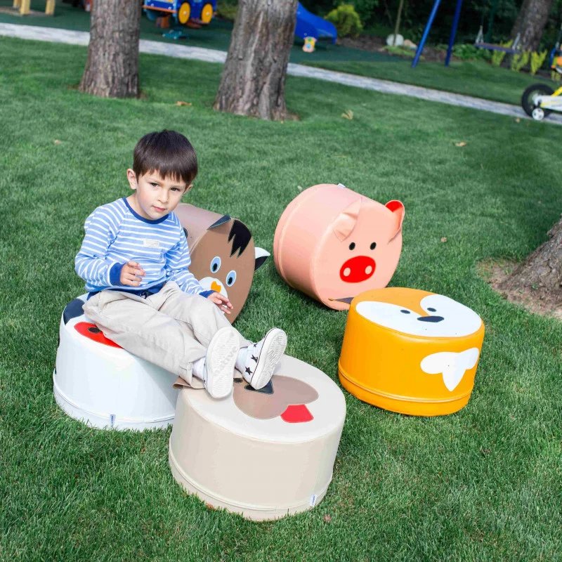 Комплект плюшени животни "Animals" със забавен дизайн, перфектен за игра и като мебел, идеален за дома или образователни и развлекателни институции. Привлича вниманието на децата с дизайни с апликации и мотиви на лисица, котка, прасенце, кученце, жаба и крава. Лесен за преместване, безопасен поради липсата на твърди ъгли, издръжлив и хипоалергенен. Плътност на порест каучук 22 kg/m³, материал PVC/екологична кожа. Съдържа 6 впръсквания с размери 40×40×24 cm, общо тегло 9,1 kg, обем 0,23 m³. Препоръчва се за интериор; навън само при сухо време. Почиствайте с нормални препарати, без хлор или разтворители.