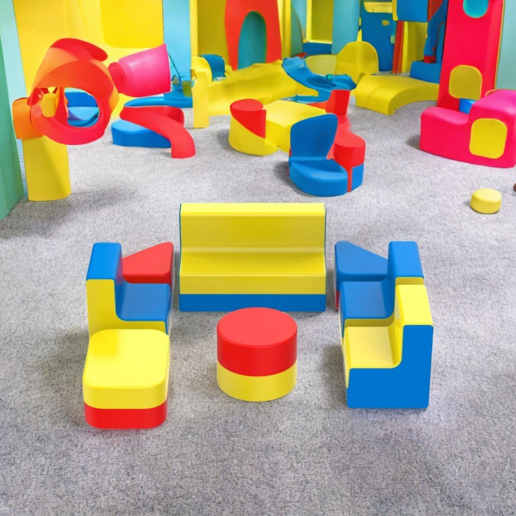 Детски комплект мебели "Living" състоящ се от 3 фотьойла, 1 диван, 1 кръгла тахта, 2 ъглови тахти и 1 правоъгълна тахта. Височината на седалката е 30 см, а на масата пуф 40 см. Размери: фотьойл 50×50 см с облегалка 30 см, диван 100×50 см с облегалка 30 см, общи размери в сглобен вид 2,0×1,7×0,6 м. Изработен от PVC плат 630 g/m² или европейска екологична кожа, първичен пенополиуретан пълнеж 22 kg/m³, оборудван с ципове и стълба.