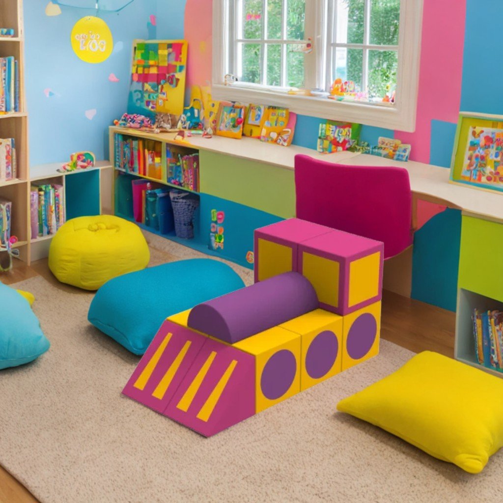 Комплектът софтплей модул "Влакче" съдържа 11 части - 8 кубчета, 2 триъгълника, 1 полуцилиндър